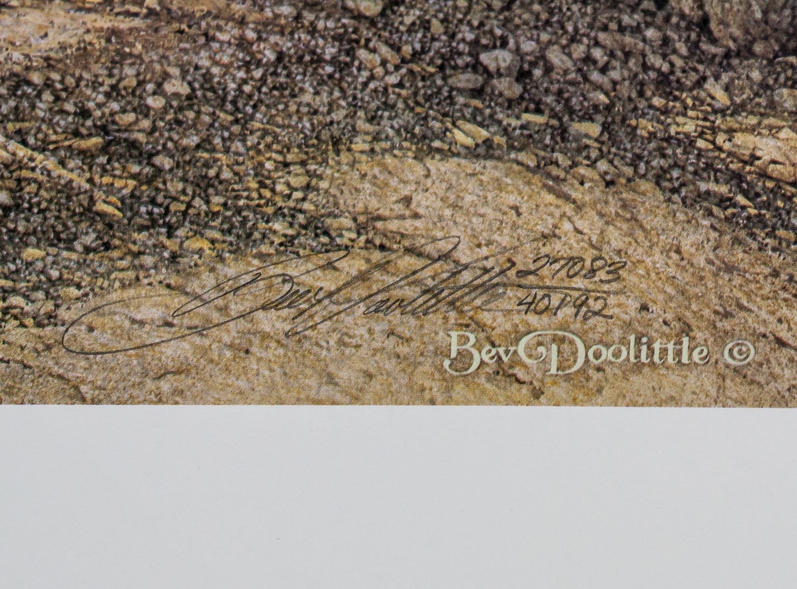 Lithograph on paper. Entitled, "Sacred Circle." Signed by Bev Doolittle (born 1947, American) and numbered 27083/40192 in pencil. 58.2 x 58.2 cm (23 x 23 in), Boarder: 67.5 x 66 cm (26.5 x 26 in). Bev Doolittle (born 1947) is an American artist working mainly in watercolor paints. She creates paintings of the American West that feature themes of Native American life, wild animals, horses, and landscapes. Accompanied with document with artist biography and contextual background of piece. PROVENANCE: Eglinton Square Gallery. Thence by descent.