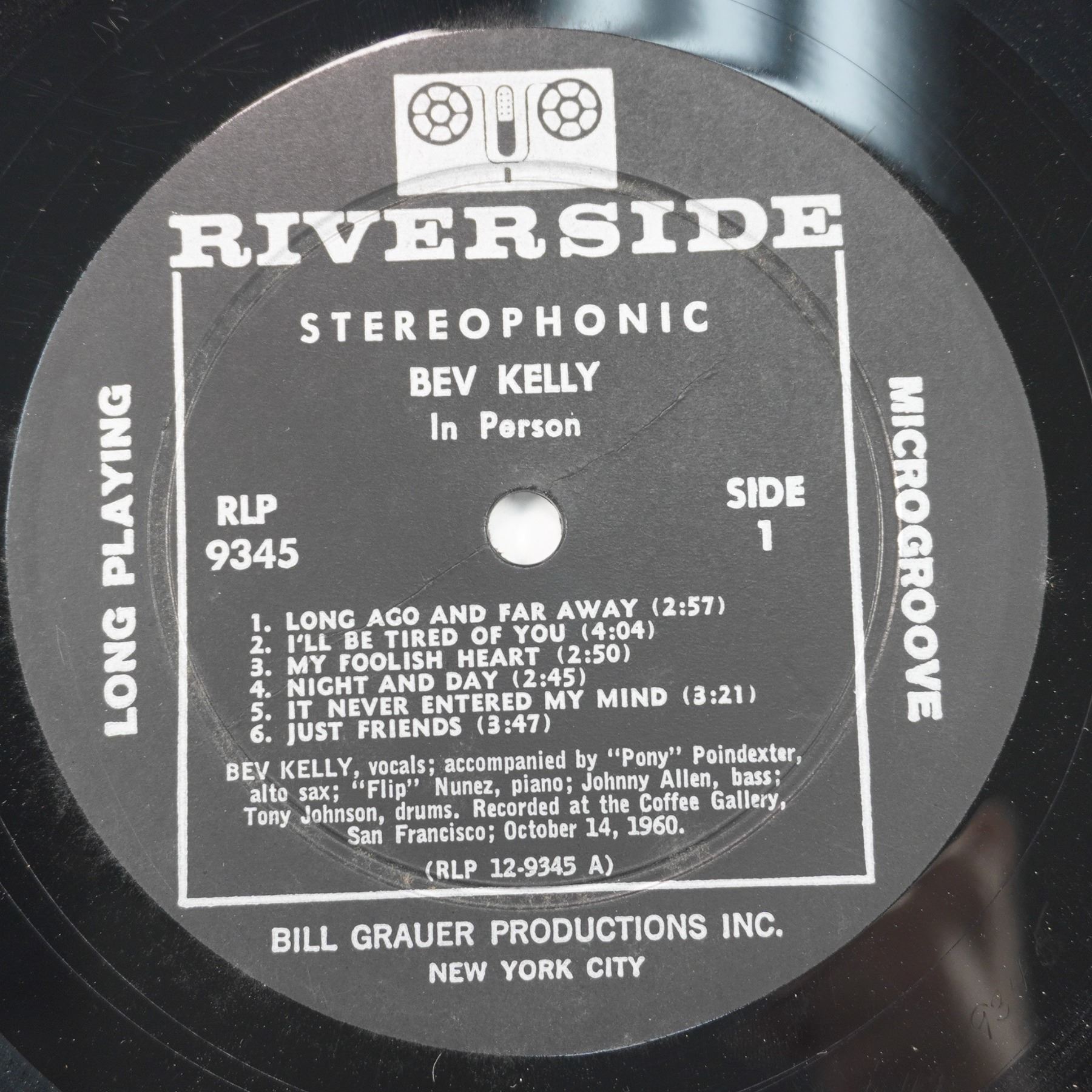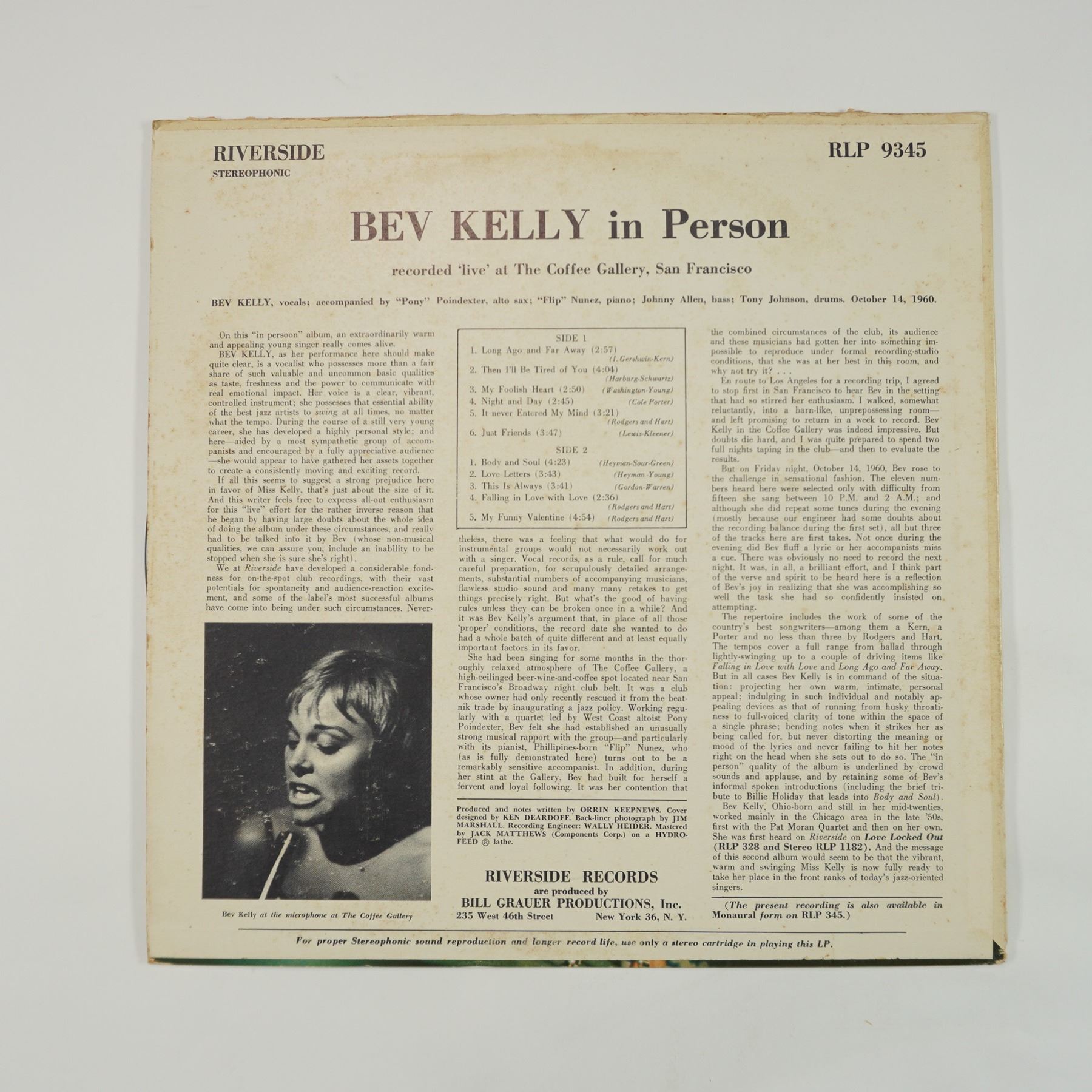 Original 1960 pressing of Bev Kelly in Person, released on Riverside Records (RLP 9345). Recorded live at The Coffee Gallery in San Francisco, this album captures Kelly's emotive and intimate vocal style in a small jazz club setting. Featuring standout performances of A Woman's Way, Give Me the Simple Life, and My Foolish Heart, the LP highlights her remarkable phrasing and deep connection to the material. A sought-after live recording for jazz vocal enthusiasts and Riverside collectors.