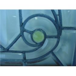 Leaded glass window. All beveled with vaseline, two round brilliant cut medallions. 17-1/2" x 38-1/2". Condition: Excellent
