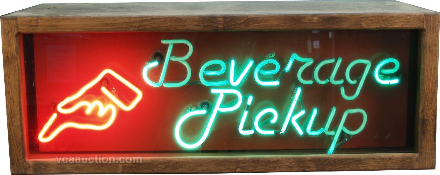 "Beverage Pickup" Neon Sign w/ Finger Pointing, in wood box - 43" x 19" x 16" tall