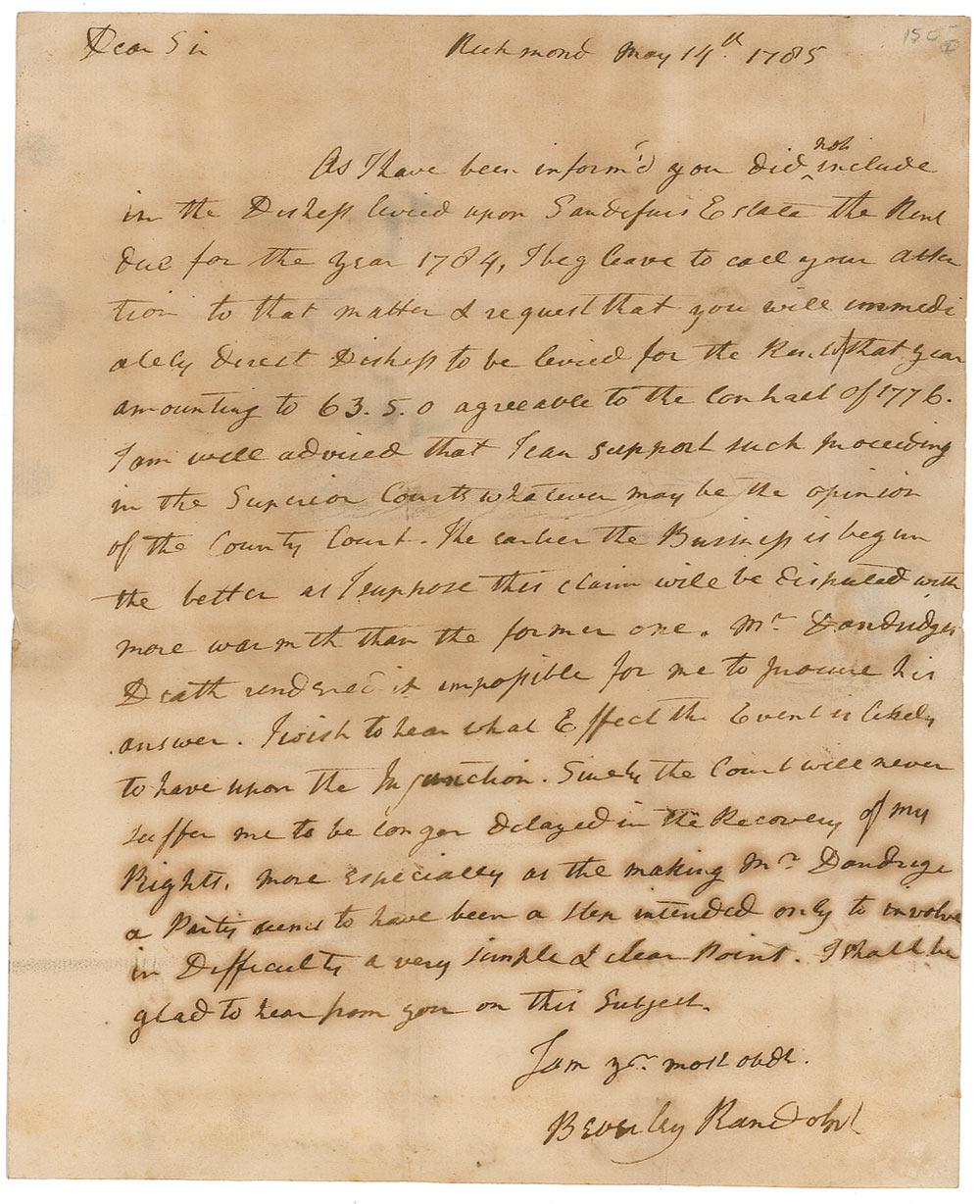Former governor of Virginia (1754–1797) who served as the state’s eighth governor. ALS, one page, 7.75 x 9.5, May 14, 1785. Letter to attorney Thomas Miller. In part: “I am well advised I can support such proceeding in the Superior Court whatever may be the opinion of the County Court. The earlier the Business is begun the better as I suppose this claim will be disputed with more warmth than the former one. Mr. Dandridge’s death rendered it impossible for me to procure his answer.” In very good condition, with intersecting folds, two through single letters of signature, scattered toning and foxing, and haloing to some of the text.