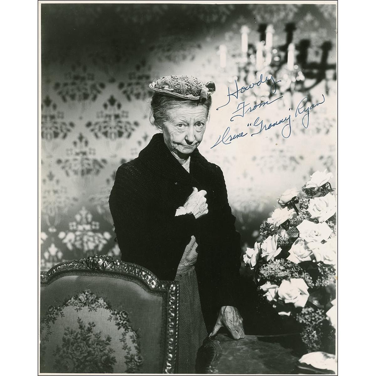 Glossy 7.75 x 9.75 photo of Ryan in character from The Beverly Hillbillies, drawing her shawl around her shoulders and looking disapprovingly at the camera. Signed in blue fountain pen, “Howdy From Irene ‘Granny’ Ryan.” Scattered surface creasing, scattered spotting to the emulsion, edge dings, and trimmed edges, otherwise fine condition.