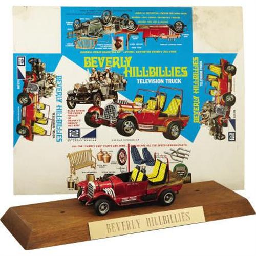 <B>George Barris</B></I> <B><I>Beverly Hillbillies</B></I></B></I> <B>Model Kit Prototype.</B></I> In the seventh season episode "The Hot-Rod Truck" of <I>The Beverly Hillbillies,</B></I> Jethro decides to build a hot rod version of the family pick-up and challenges Granny and the old truck to a drag race. (A little of Granny's white lightning in the tank allowed her to beat Jethro easily -- while driving in reverse.) In 1968, MPC released a model kit that featured parts for both versions -- the original Clampett pick-up and Granny's Haulin' Hot Rod. Since then, the vintage kit has become a collector's item among model builders. This is a completed test version of the model for the hot rod variant of the kit, fully assembled and painted, measuring 2.75" x 3" x 7" with a 16" x 1" x 5" wooden display base. It is also accompanied by a proof sheet of the original box lid art. All items are in Very Fine to Excellent condition, with some small areas of paint loss to the model and mild wear to the proof. <I>From the George Barris Archive.</B></I><BR><BR><b>Shipping:</b> Miscellaneous Collectibles, Larg (<a target="_blank" href="http://www.heritageauctions.com/common/shipping.php">view shipping information</a>)