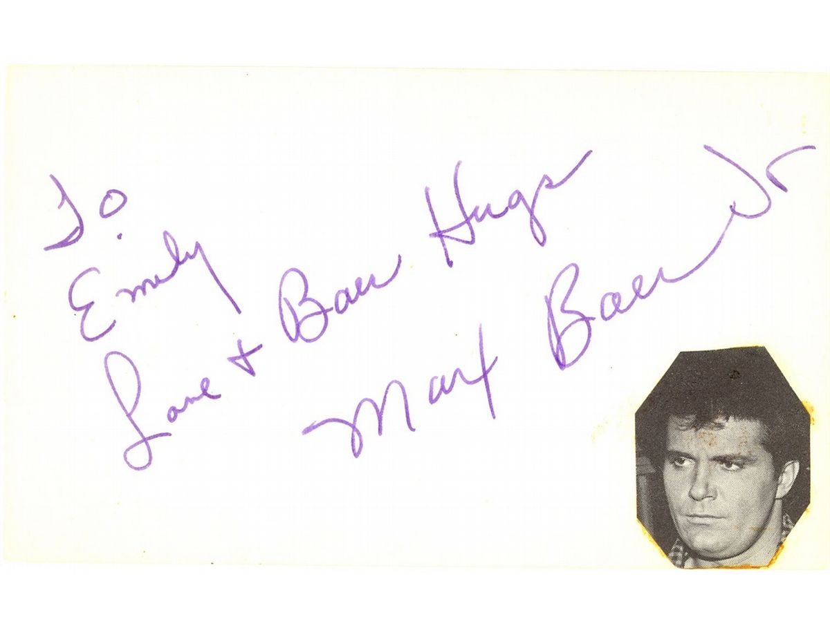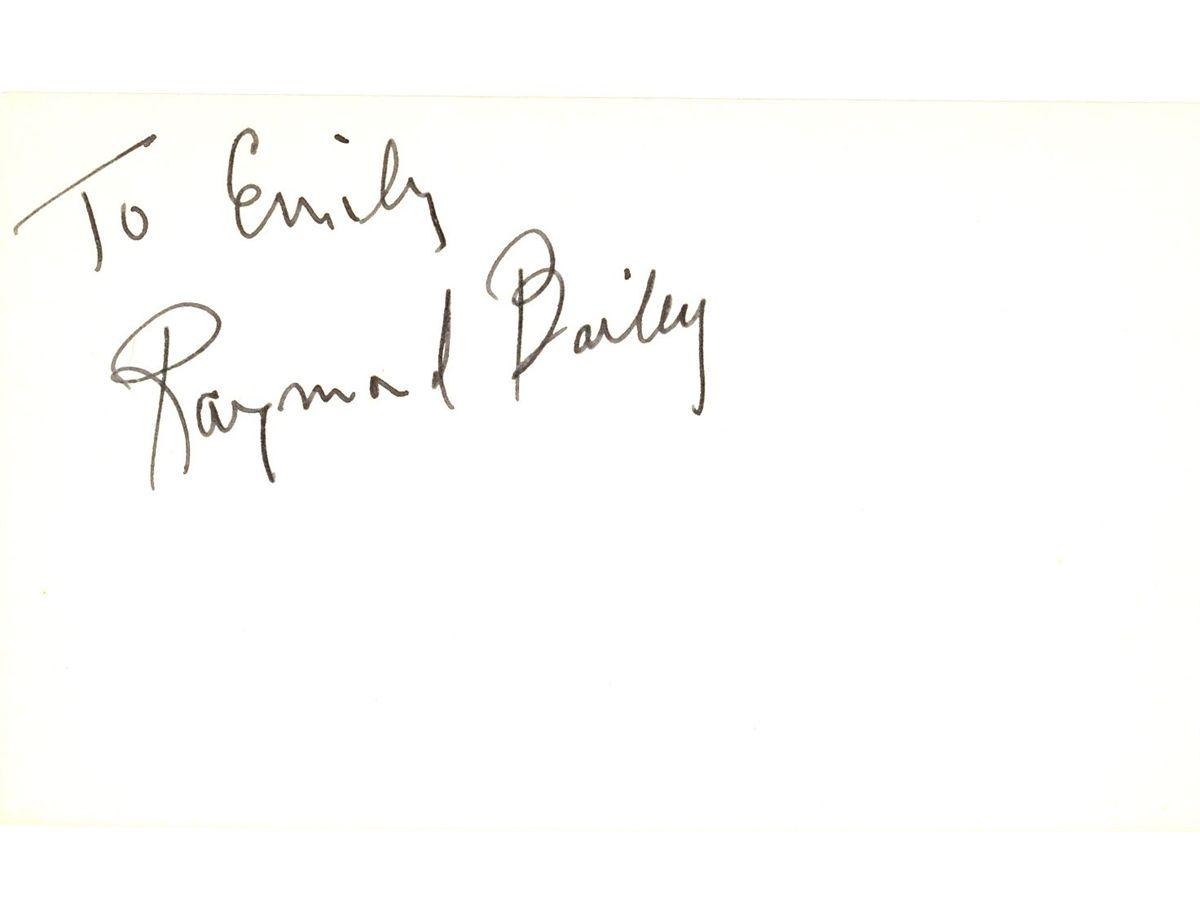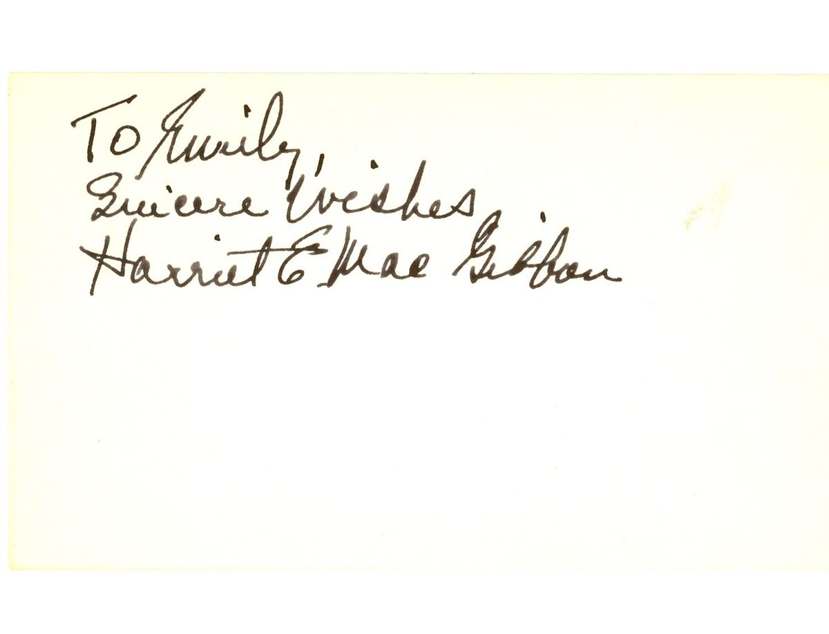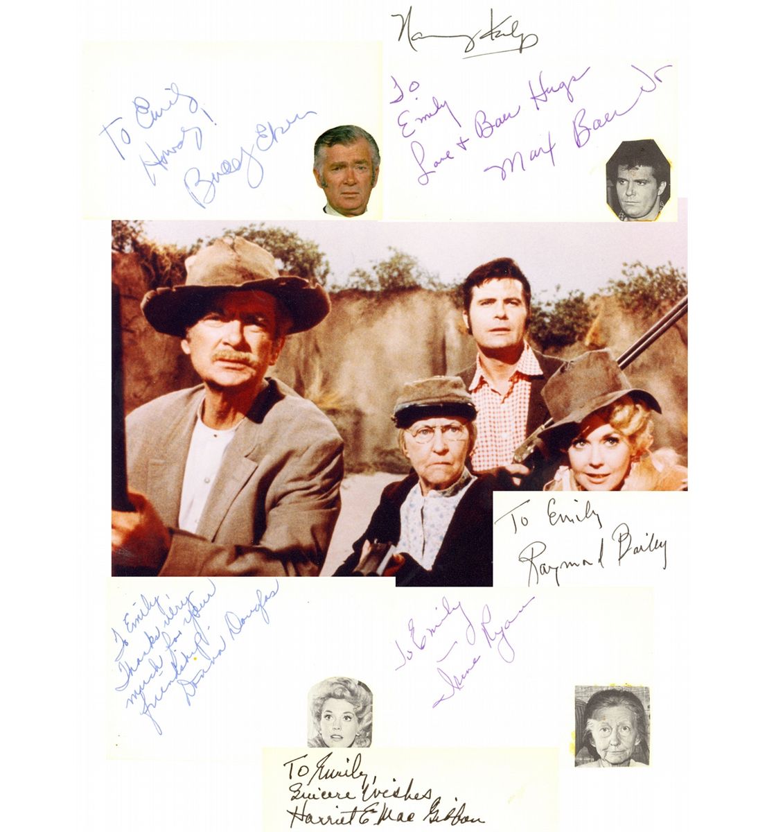 Seven vintage in-person ink signatures on individual off-white 5 x 3 cards, six inscribed to "Emily." Signers are: Buddy Ebsen, Irene Ryan, Max Baer, .Jr., Donna Douglas, Raymond Bailey, Harriet E. MacGibbon, and Nancy Kulp.