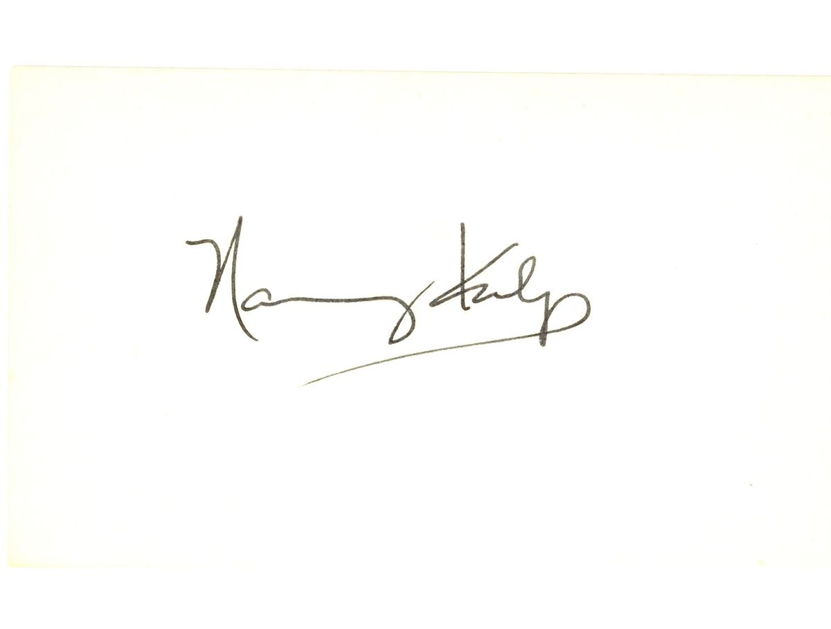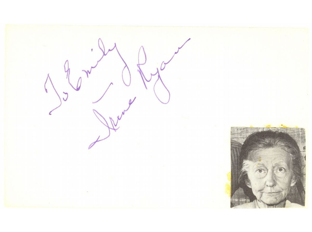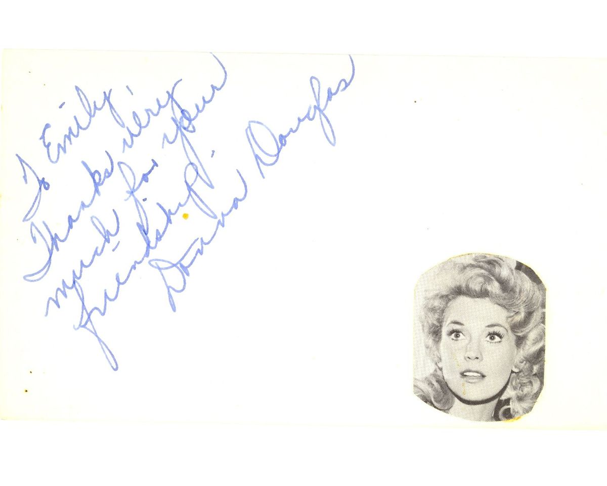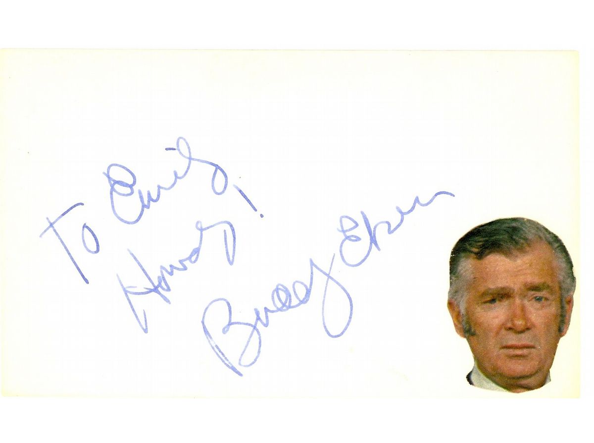 Seven vintage in-person ink signatures on individual off-white 5 x 3 cards, six inscribed to "Emily." Signers are: Buddy Ebsen, Irene Ryan, Max Baer, .Jr., Donna Douglas, Raymond Bailey, Harriet E. MacGibbon, and Nancy Kulp.