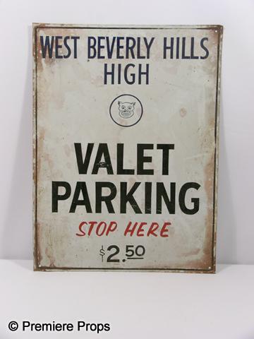 "Beverly Hills, 90210" (1990) - Dirty tin metal, white and black sign with "West Beverly Hills High Valet Parking Stop Here $2.50' on the front. This sign is from the original Beverly, 90210! (approx. 18" x 24"). This item is oversized and will require additional shipping charges. Please email for shipping rates prior to bidding.