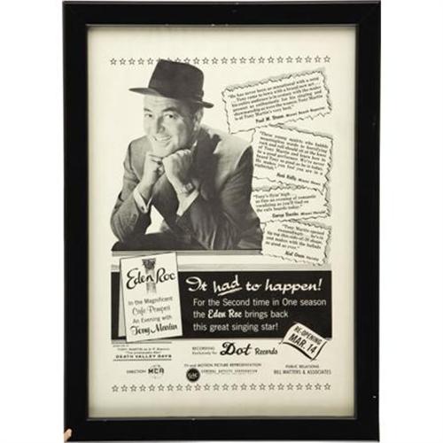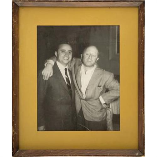 <B>Beverly Hills CENSORED Club Miscellaneous Framed Items.</B></I> Set of five b&w framed items from the early days of the Beverly Hills CENSORED Club. Included is a 14" x 19.5" print ad featuring Tony Martin, a large photo of unknown club members framed to 16.5" x 19.25", a pair of b&w photos of club members matted and framed to 16" x 23" (glass missing, mild to moderate wear to frame), a May 14, 1969, Los Angeles <I>Times</B></I> article framed to 9" x 27", and a July 16, 1995 <I>Times</B></I> article on Milton Berle framed to 15" x 19", all from the walls of the club. Items are in overall Very Fine condition unless stated otherwise. <I>From the Beverly Hills CENSORED Club Celebrity Roast Archive.</B></I><BR><BR><b>Shipping:</b> Framed - with Glass, Small (<a target="_blank" href="http://www.heritageauctions.com/common/shipping.php">view shipping information</a>)