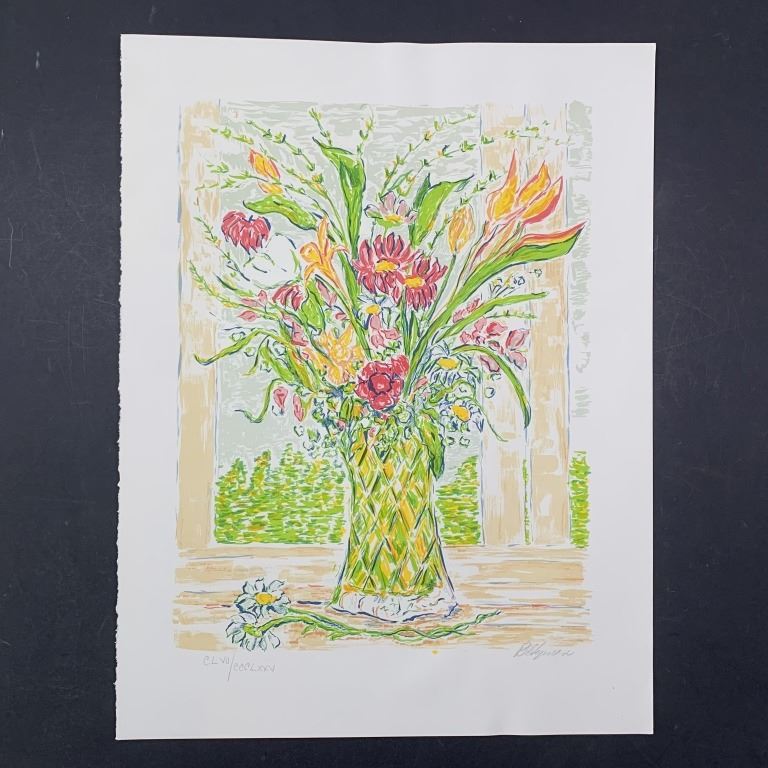 Beverly Hyman's "Flower Arrangement" Limited Edition Print. A Glass vase is full with a beautiful floral arrangement. This piece is signed in the lower right and numbered CLVII/CCCLXXV in the lower left. This piece is in excellent condition