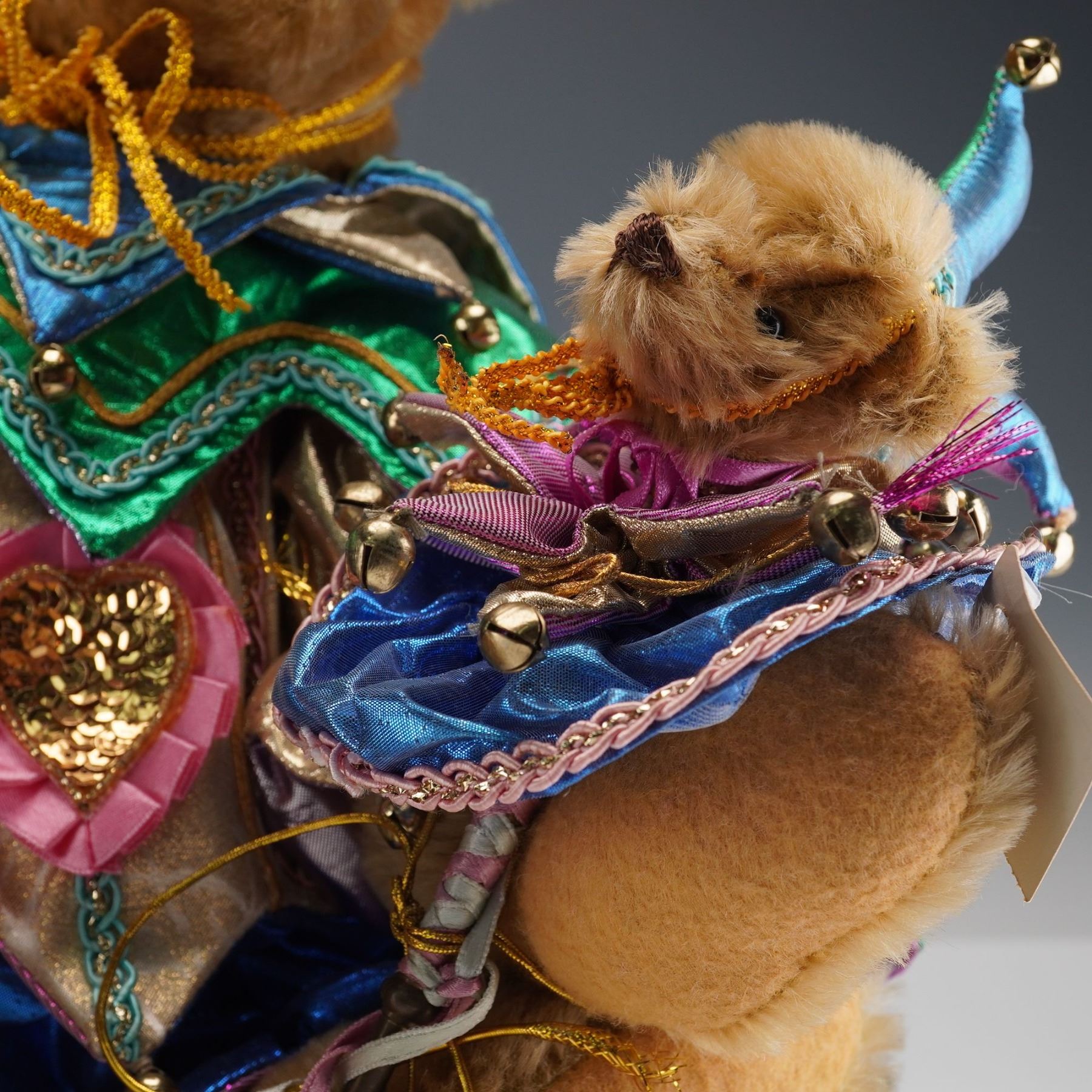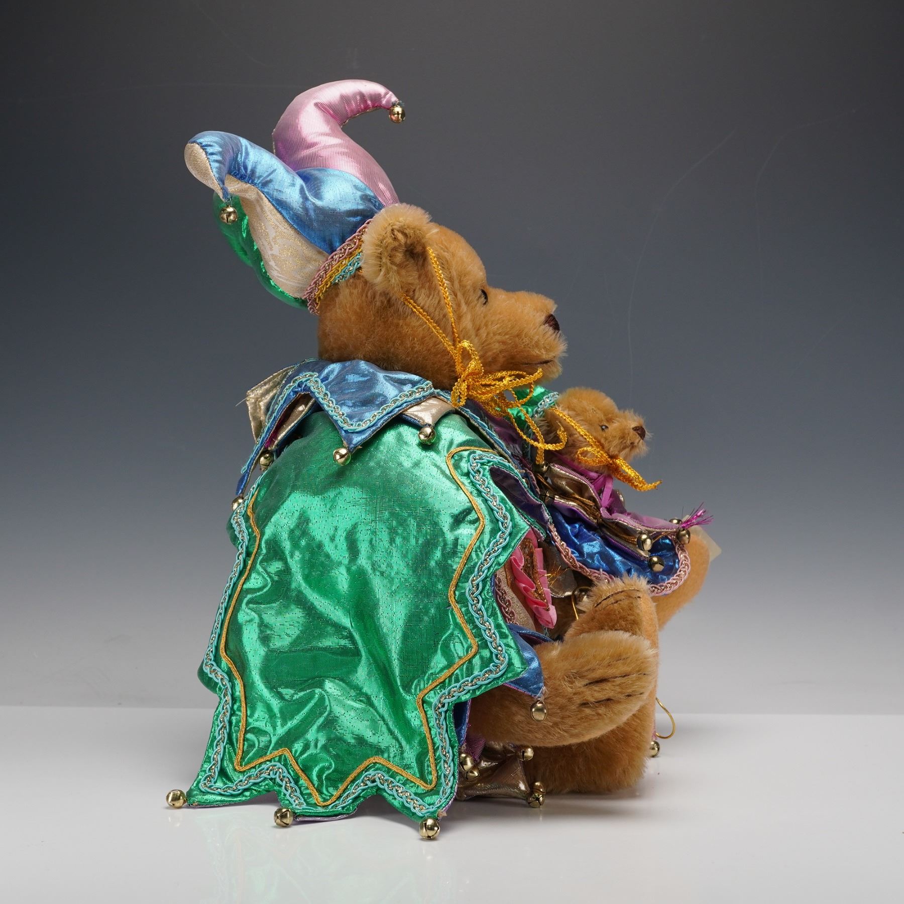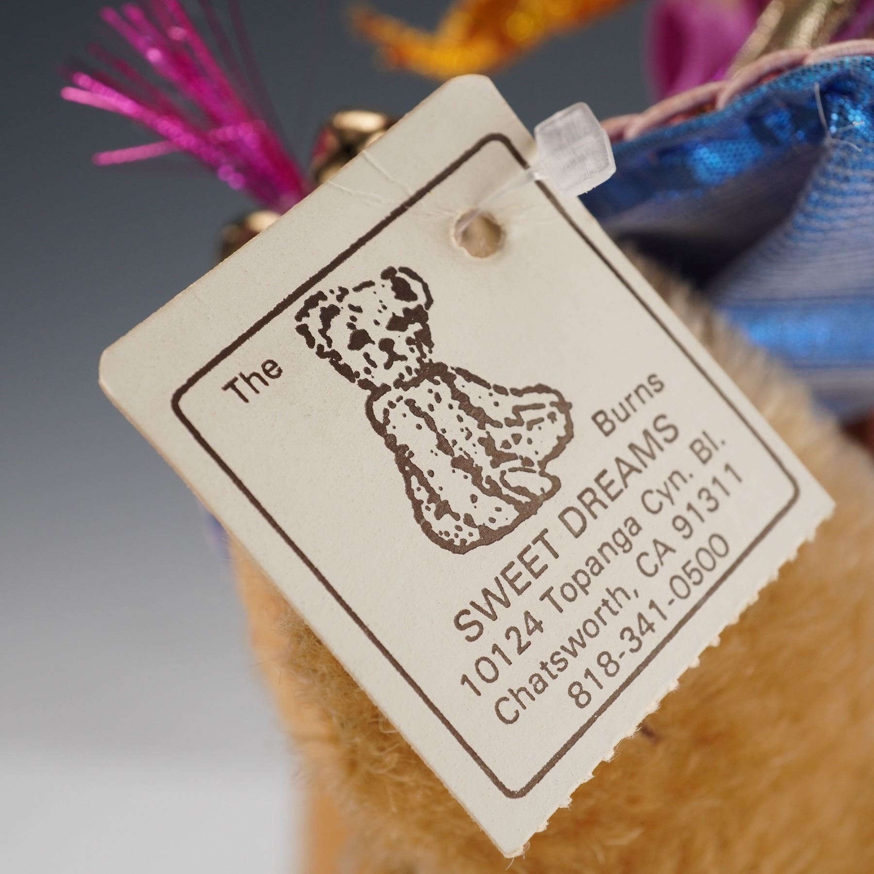 This delightful collectible teddy bear set was designed by renowned artist Beverly Port as part of her acclaimed Time Machine Teddies series and handcrafted by The Burns Sweet Dreams studio in Chatsworth, California. The large bear and matching cub wear exquisitely detailed metallic jester costumes in jewel tones of green, blue, purple, and gold, accented with bells, ribbons, and gilt trim. The larger bear contains a wind-up music box mechanism that plays a soft lullaby tune. The bear retains its original Sweet Dreams tag and displays exceptional craftsmanship typical of this collaborative series between Beverly Port and The Burns Sweet Dreams. A whimsical and rare example from the mid 1980s, this set makes a stunning addition to any collection of artist teddy bears or Time Machine Teddies.