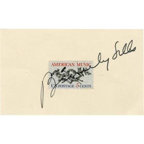 <B>Beverly Sills Autograph.</B></I> A 5" x 3" card, with a five-cent commemorative postage stamp affixed, signed by the operatic soprano in black ink. The signature extends across the face of the stamp and is large and clean. In Excellent condition.<BR><BR><b>Shipping:</b> Flat Material, Small (<a target="_blank" href="http://www.heritageauctions.com/common/shipping.php">view shipping information</a>)