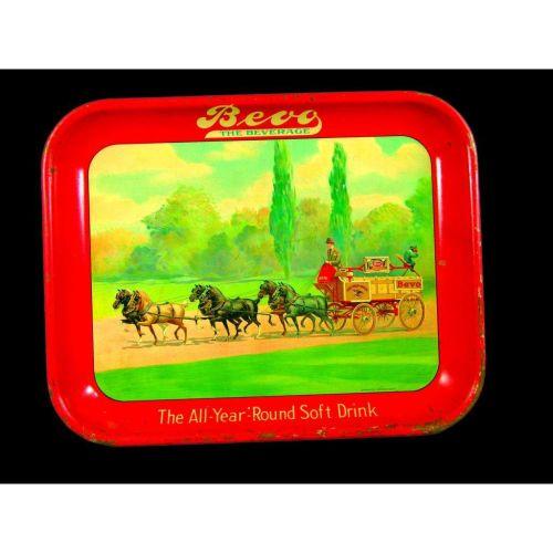 Bevo Soft Drink Tin Serving Tray. Depicting Horse Drawn Delivery Wagon. Chips around the edge otherwise Good Condition. 13 1/4 x 10 1/2 inches.
