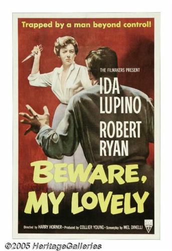 <B>Beware My Lovely (RKO, 1952).</B></I> One Sheet (27" X 41"). The always classy Ida Lupino stars as a housewife who hires Robert Ryan as a handyman. It turns out the hired help, unbeknown to Ms. Lupino, is actually a psychotic killer. There is slight fold line wear, a faint stain in the upper left graphics, and pinholes and small tears along the borders. The poster has been professionally restored, rendering these defects difficult to detect. Very Fine on Linen. ****