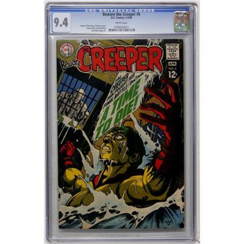 <B>Beware the Creeper #6 (DC, 1969) CGC NM 9.4 White pages.</B></I> Steve Ditko and Jack Sparling art. Overstreet 2007 NM- 9.2 value = $75. CGC census 9/07: 2 in 9.4, 1 higher. <I> From the Fantastic Frank Collection.</B></I><BR><BR><b>Shipping:</b> Comics - Unslabbed (<a target="_blank" href="http://www.heritageauctions.com/common/shipping.php">view shipping information</a>)