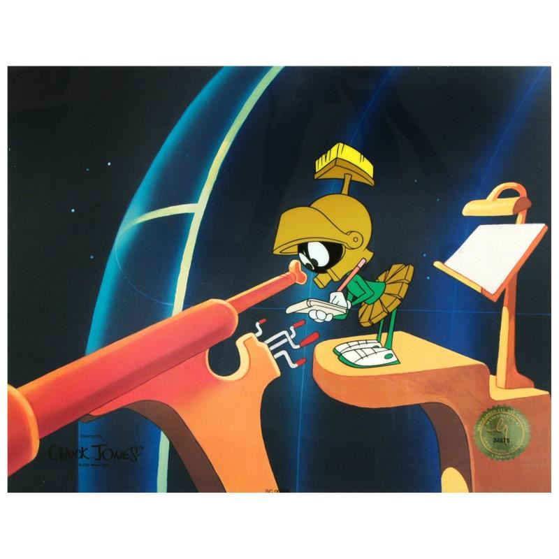 This meticulously crafted sericel features Marvin the Martian, one of a host of memorable cartoon characters created by Chuck Jones (1912-2002)! "Beware the Eyes of Mars" is a sold out limited edition animation sericel that includes Certificate of Authenticity attached in verso! Measures approx. 14" x 11".