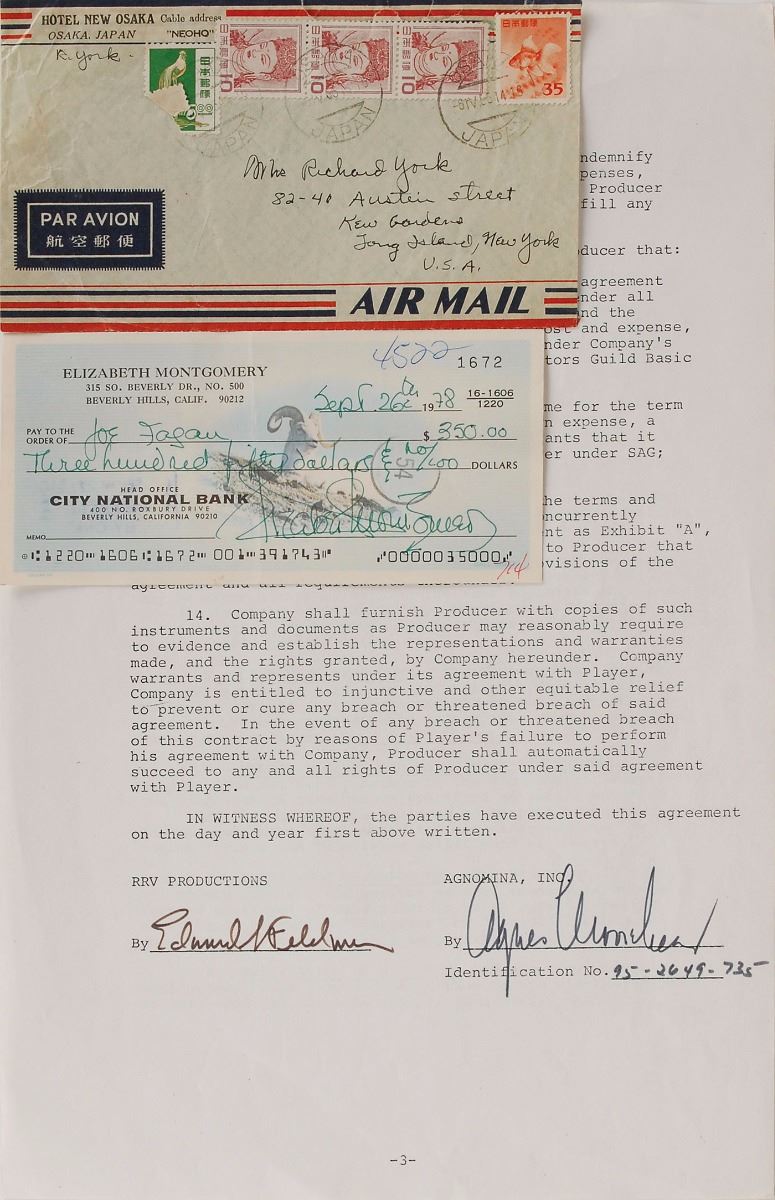Three items signed by cast members of Bewitched, including: Agnes Moorehead (DS), Elizabeth Montgomery (check), and Dick York (envelope). In overall fine condition, with creasing and tears to the envelope.
