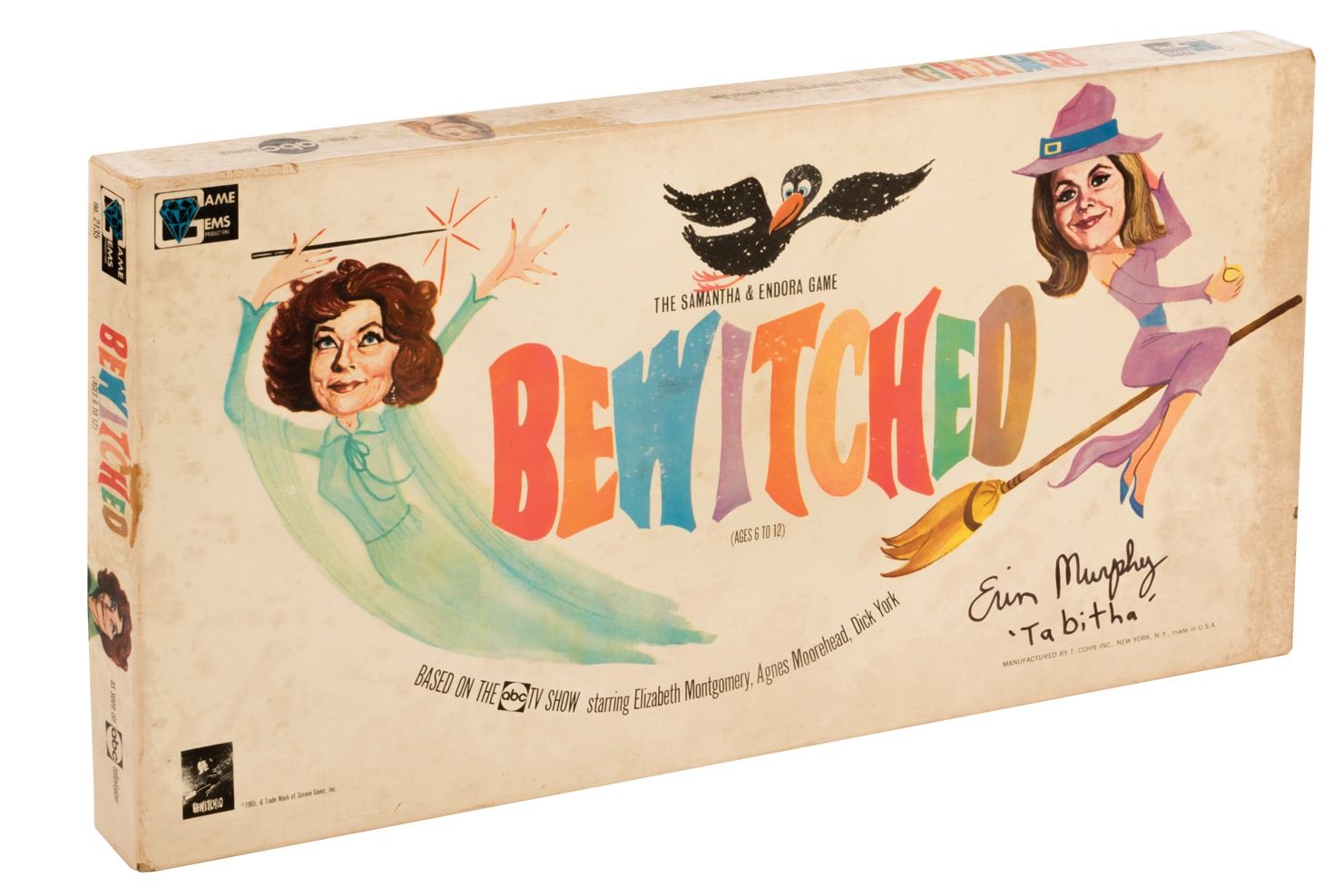 14. Bewitched board game signed by Erin Murphy "Tabitha Stephens".(ABC-TV, 1964-1973) Vintage original Game Gems brand complete board game housed in 18.5 x 9.5 x 1.65 in. box featuring delightful illustrations of "Endora" (Anges Moorehead), "Samantha" (Elizabeth Montgomery), and has original pieces, spinners and board. Signed on box top, "Erin Murphy Tabitha'", in black ink. Exhibiting age, wear, soiling to box, breach to bottom of box, and rubbing to spine of board. In vintage good condition. $100 - $200