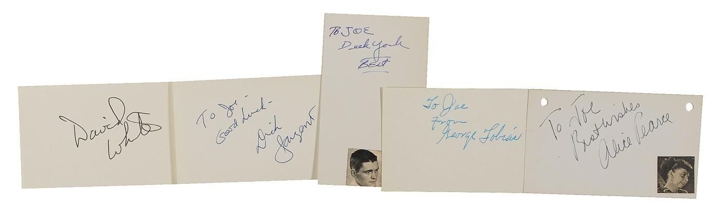 In-person ink and felt tip signatures of Dick York (ins), Dick Sargent (ins), Alice Pearce (ins), George Tobias (ins), and David White on individual off-white 5 x 3 cards, two with clipped photos of the respective signer affixed to their cards. In fine condition, with two punch holes to top edge of Pearce’s card. York is uncommon in any form.