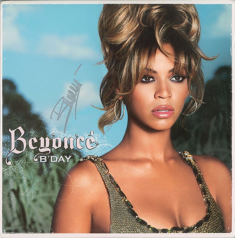 B'Day album signed on the front cover in silver ink by Beyonce. In fine condition, with a noticeable crease to the upper right corner. The record is included.