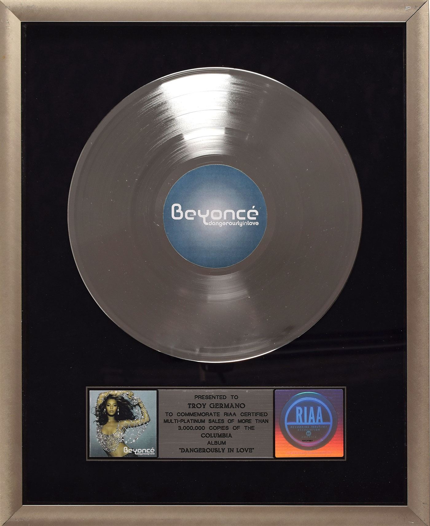 Official serial number hologram-style RIAA triple-platinum sales award presented “to Troy Germano to commemorate RIAA certified multi-platinum sales of more than 3,000,000 copies of the Columbia album 'Dangerous in Love.'” Framed with its plate, a small image of the album cover, and disc to an overall size of 17.25 x 21.25. Award retains its original backing with Ill–Eagle Enterprises and Germano Studios of New York labels. In fine condition.