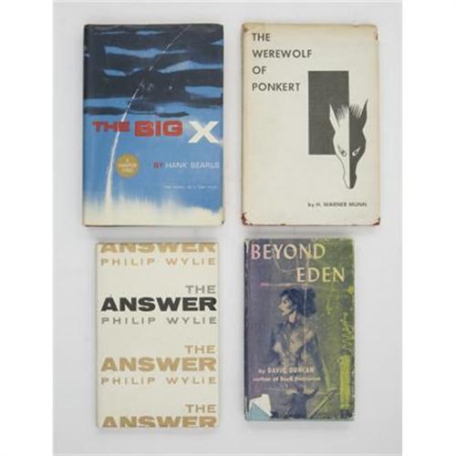 <B>Three Science Fiction First Editions from the 1950s, One Signed</B></I>, including: <B>David Duncan. </B></I><B><I>Beyond Eden</B></I></B></I>. New York: Ballantine Books, [1955]. First edition. Twelvemo. 169 pages. Publisher's turquoise cloth with blue spine titles. In original pictorial dust jacket. Book mildly worn around the edges. Textblock toned throughout. Dust jacket rubbed and worn, with a three-quarter-inch open tear at the front spine fold, and minor chipping at the spine ends. Overall, a good, solid copy. [and:] <B>Hank Searls. </B></I><B><I>The Big X</B></I></B></I>. New York: Harper & Brothers, [1959]. First edition. Octavo. 241 pages. Publisher's red over gray cloth with black titles. In original pictorial dust jacket. Mild edge wear to the boards. Dust jacket has minor wear at the spine ends and corners, else a fine copy. [and:] <B>Philip Wylie. </B></I><B><I>The Answer</B></I></B></I>. New York Toronto: Rinehart & Company, Inc., [1955]. First edition. Twelvemo. 63 pages. Publisher's cream paper over boards with gilt and black titles. In original pictorial dust jacket. Very good condition. <I>From the Robert and Diane Yaspan Collection.</B></I><BR><BR><b>Shipping:</b> Books & Catalogs (<a target="_blank" href="http://www.heritageauctions.com/common/shipping.php">view shipping information</a>)