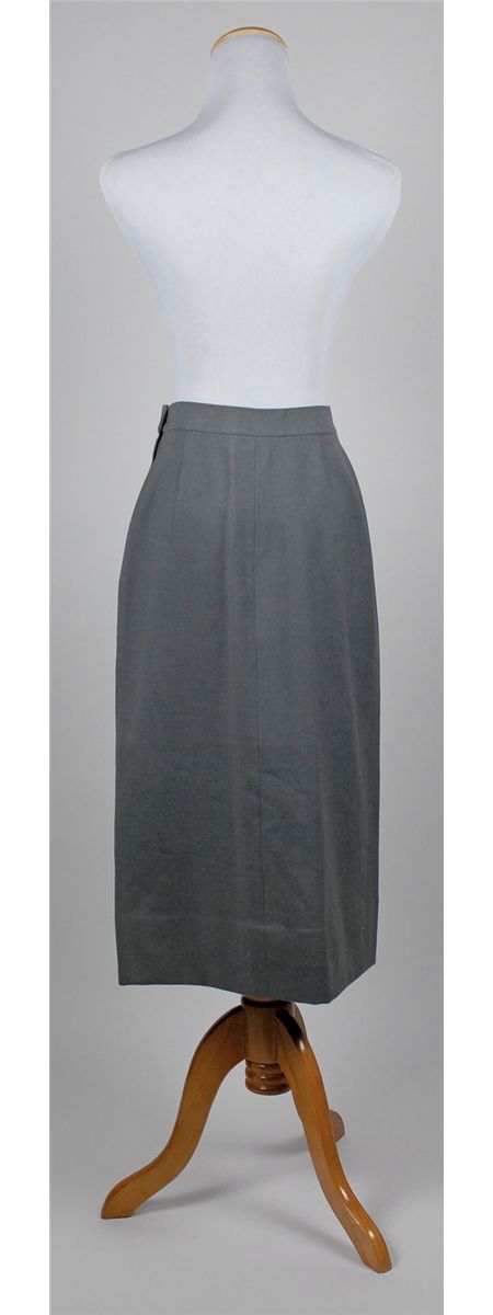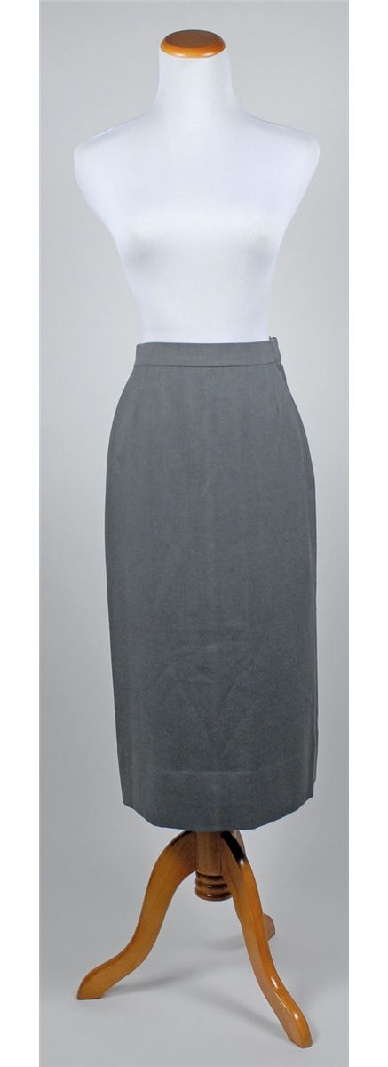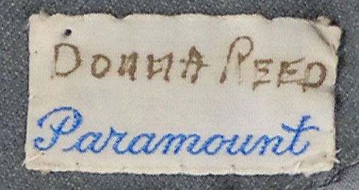 Skirt, designed by Edith Head, and worn by Reed in the 1948 film Beyond Glory. Light gray mid-calf length skirt has two snaps and one hook and eye closure, as well as a zip-up back. A small Paramount label is sewn into the waistband with Reed’s name written across the top. In fine condition.