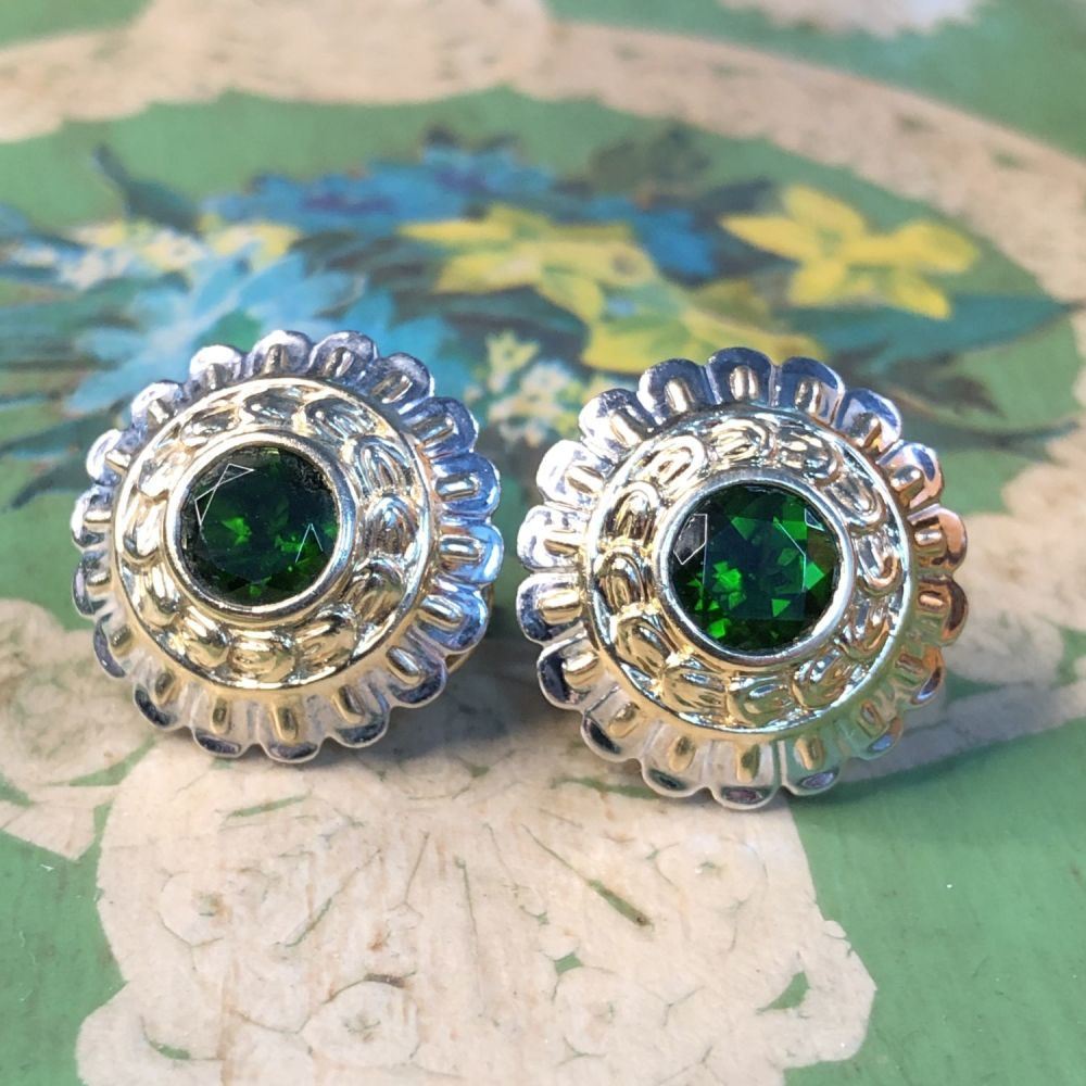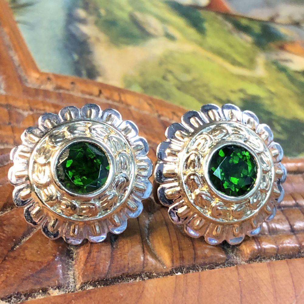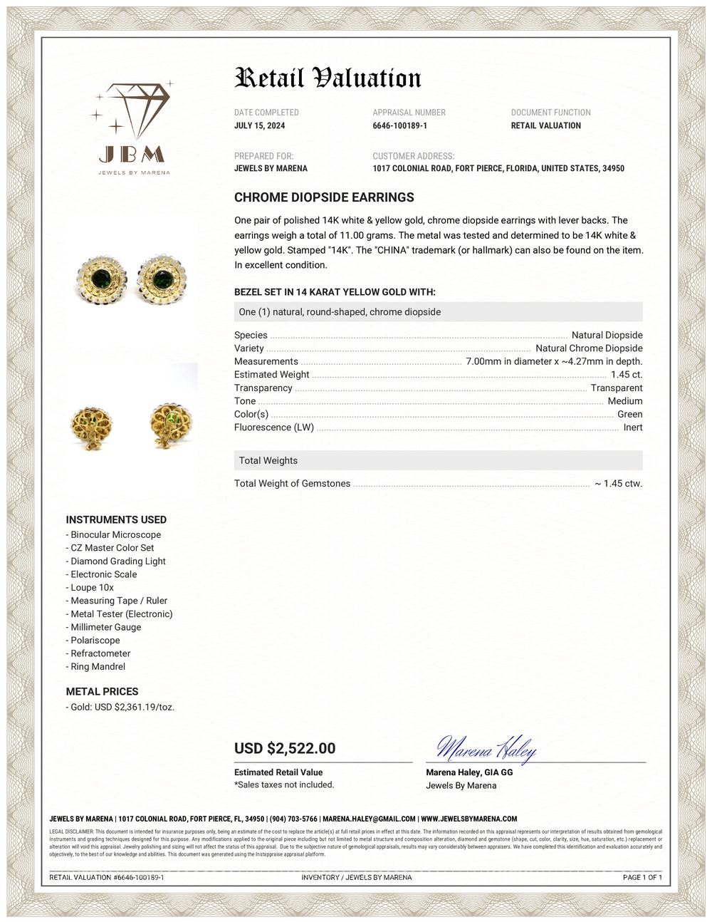 S/11.0-TSS TITLE DESCRIPTION: Bezel Set Chrome Diopside Earrings DESCRIPTION DETAIL: A stunning pair of Chrome Diopside lever back earrings. The gemstones are bezel set in 14k Yellow Gold with a 14k White Gold outer rim. OVERALL CONDITION: Excellent STONE: Chrome Diopside (2) Weight: ~1.45 Carat Total Weight Shape: Round, Faceted Color: Dark Green METAL: 14K Yellow Gold WEIGHT: 11 Grams SIZE: 18 mm SOURCE: Fine Jewelry Store Liquidation APPRAISAL REPORT: JBM certified and appraised these earrings with an estimated retail replacement value of $2,522. Please inquire about sizing if needed. Please allow an additional 10 days for shipping if we resize it. PRIOR TO BIDDING READ THE DESCRIPTION, TERMS, AND CONDITIONS CAREFULLY This description and condition report is provided for your convenience based on the information provided by the consignor. CAA is not responsible for any discrepancies between this information and other opinions. Buyers Premium: 18% Payment Due in 5 days All items shipped to registered address - NO EXCEPTIONS S/11.0-TSS