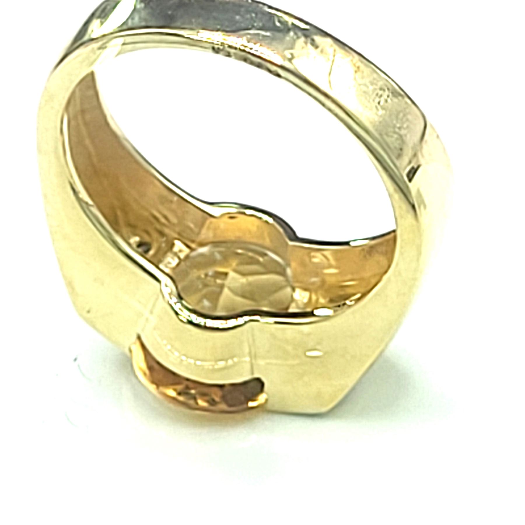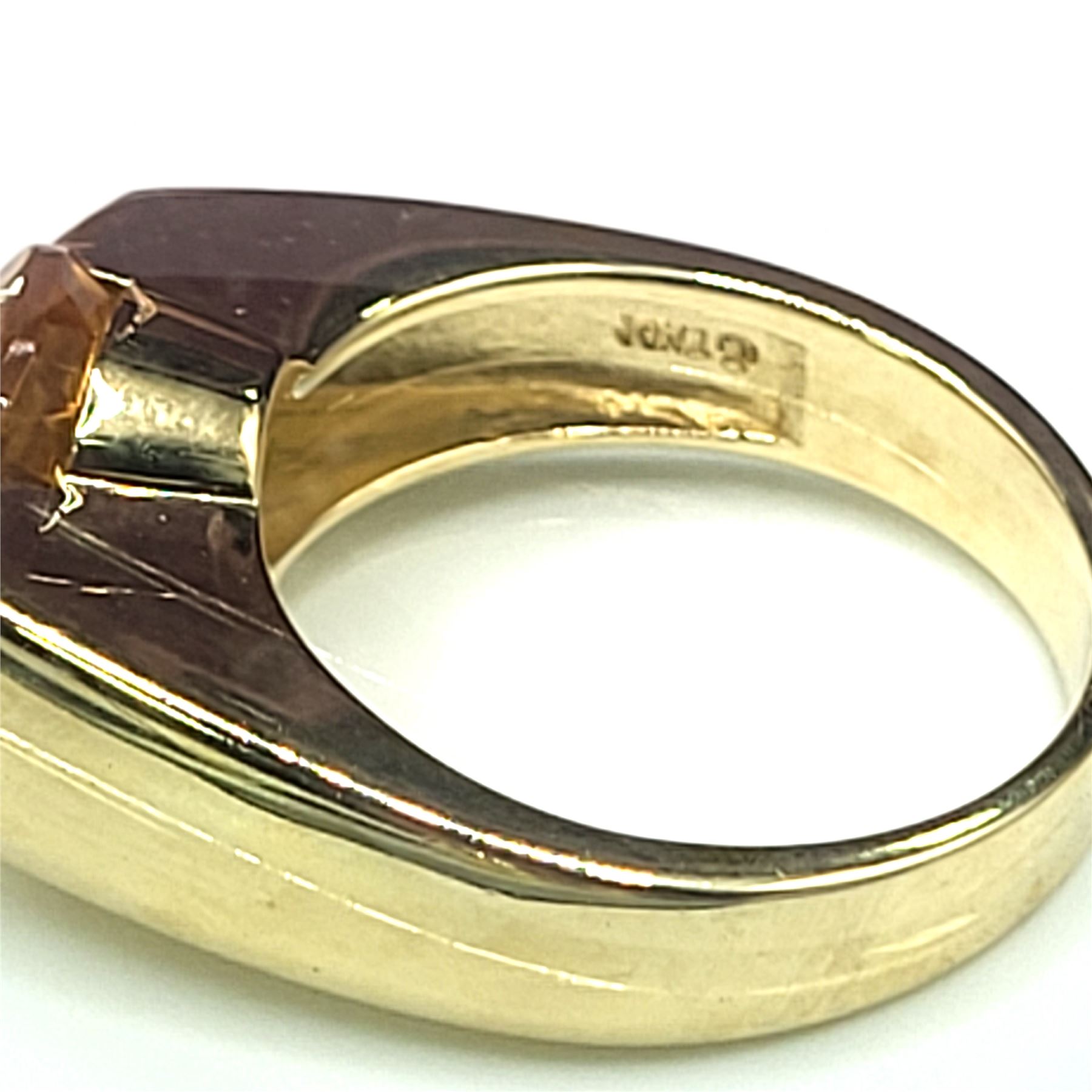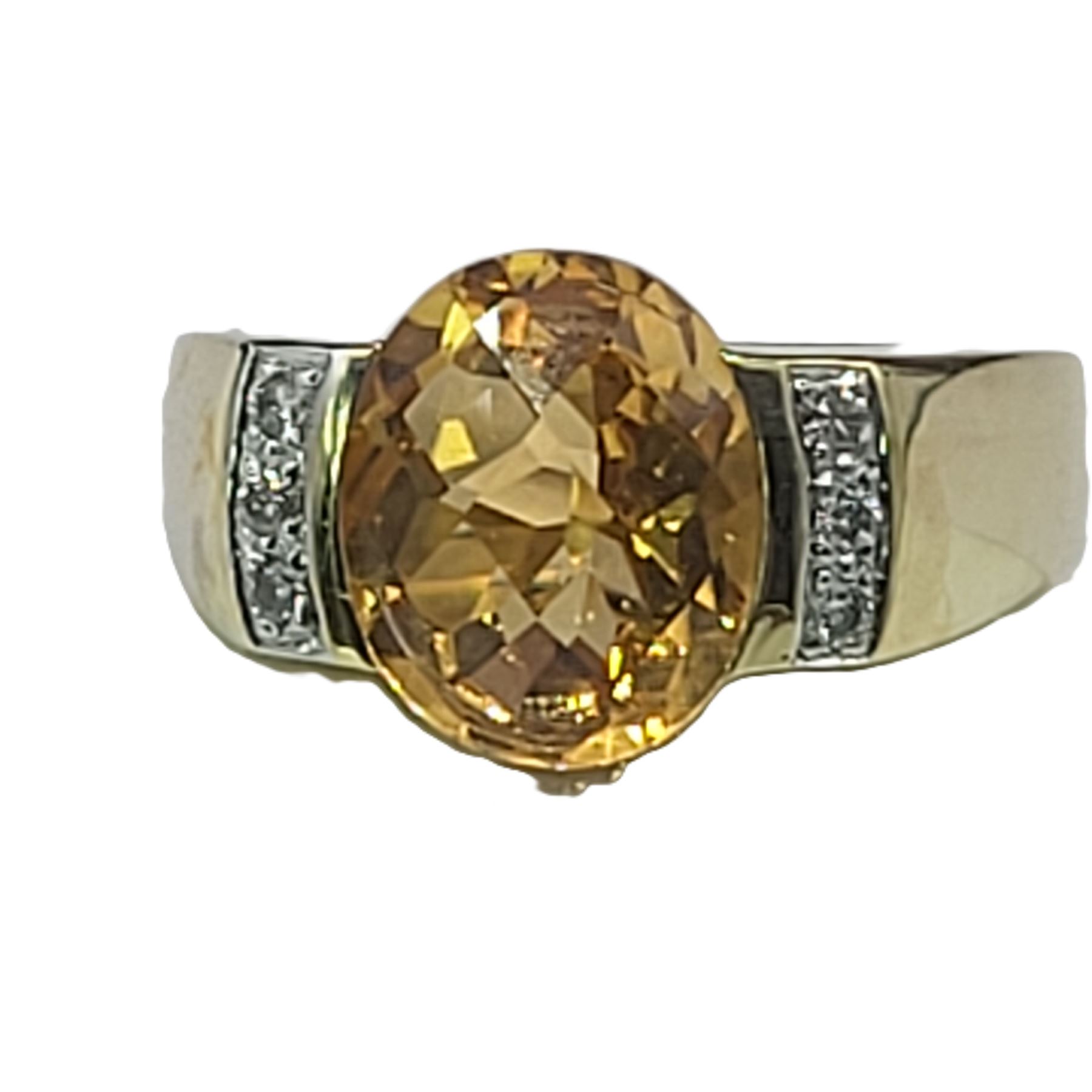 This is a 14 karat yellow gold with an approximate 3.00 carat, oval-cut, top-faceted, semi-bezel set, warm honey-colored citrine with approximately .05 carats total weight of round, brilliant-cut, approximate H-I color, SI2-I1 clarity diamonds on the shoulders.& nbsp; The ring is approximately 11 x 14 mm on the top and tapers to an approximate 4mm shank. This ring is US size 7 and can be sized for an additional charge.& nbsp; Admin: 33110/14ieh