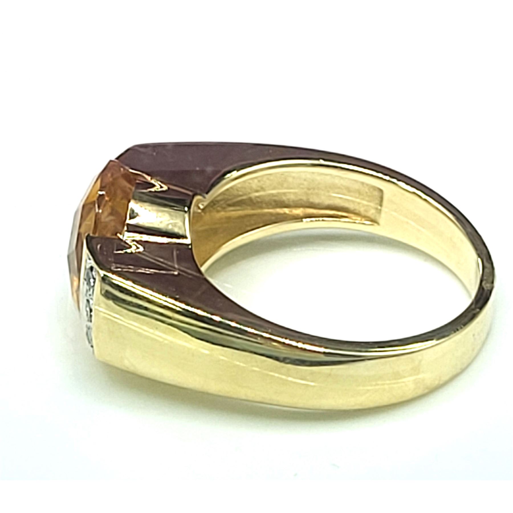 This is a 14 karat yellow gold ring with an approximate 3.00 carat, oval-cut, top-faceted, semi-bezel set, warm honey-colored citrine with approximately .05 carats total weight of round, brilliant-cut, approximate H-I color, SI2-I1 clarity diamonds on the shoulders.& nbsp; The citrine is approximately 11 x 14 mm on the top and tapers to an approximate 4mm shank. This ring is US size 7. See below for sizing details and other information.& nbsp; & nbsp;Admin: 33110/14ieh