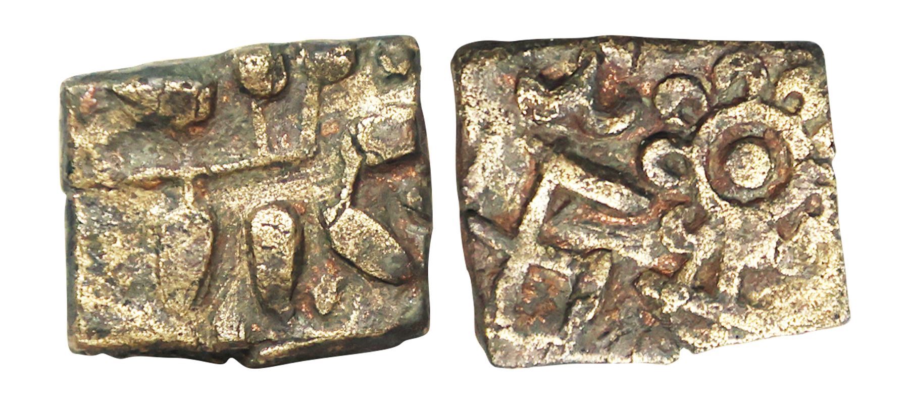 Bhon Region of Vidarbha, Post Mauryan, (2nd-1st Century BC), Copper Unit, 1.58 gms, Obv. Motifs of Flower, Triangle Standard (Indra Dhwaja), Shrivatsa and Swastika, Rev. Tree in railing with seven branches interspersed by dots, Pieper #2388, very fine+, very scarce.