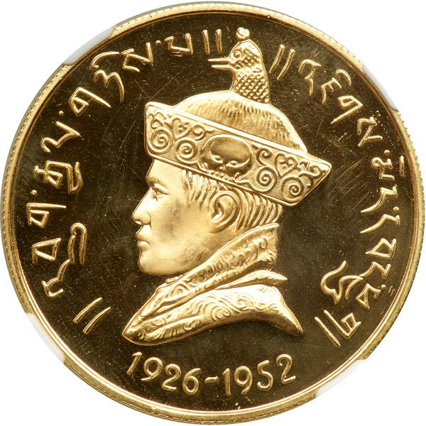 Bhutan. 5 Sertums, 1966. Fr-1; KM-35. Weight 1.1775 ounces. Mintage 598. For the 40th Anniversary Accession of Jigme Wangchuk. Bust left. Reverse: Sacred thunderbolt on Buddhist wheel of life. NGC graded Proof 63 Cameo.