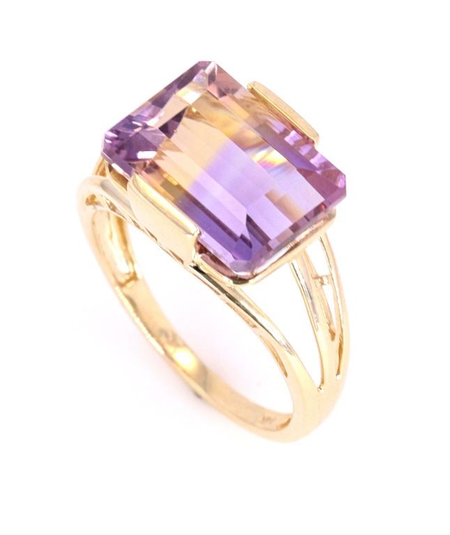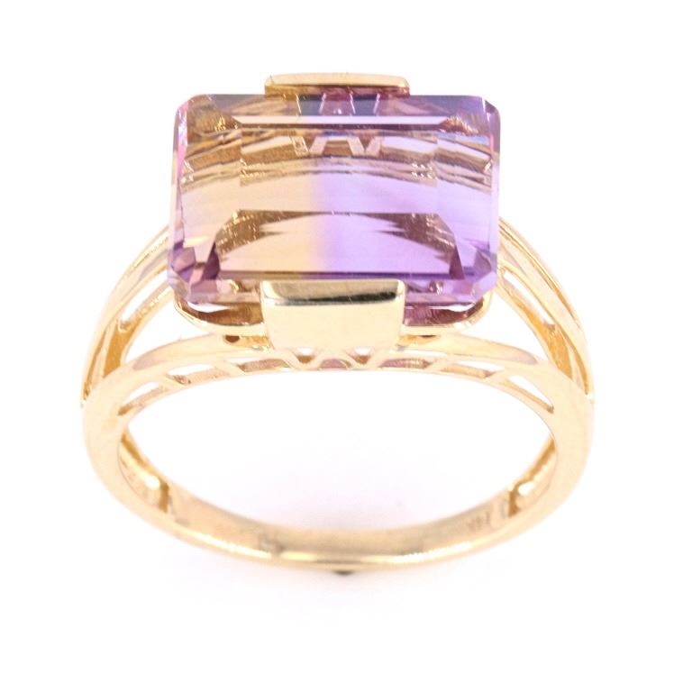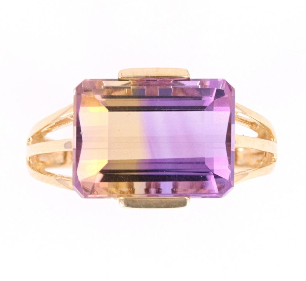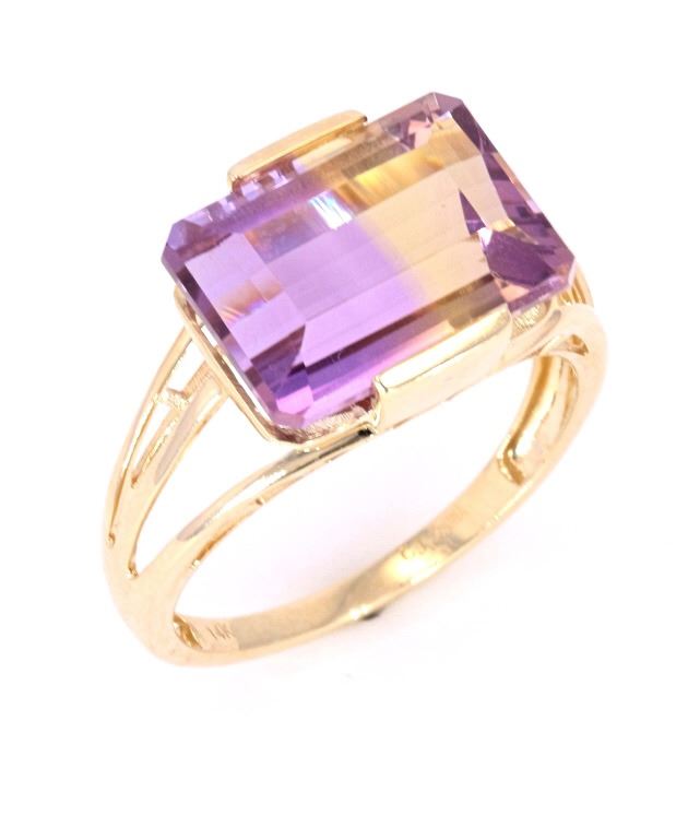 This is an unusual Ametrine large stone set in 14K gold. The center of the ring shows two bar prongs holding the emerald cut Ametrine stone with purple and yellow to orange coloring and size of 7.46 carats. The Ametrine, also known as Trystine or Bolivianite, is a mixture of Amethyst and Citrine with zoning of purple, yellow or orange and is mined in Bolivia. Distinct color zones in a gemstone is quite unique and desirable. The band is triple split and polished being hallmarked 14K CJCHINA with a 14 karat gold weight of 3.13 grams. Size of 9 US.