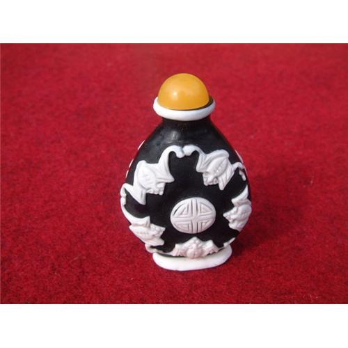 Bi-color Peking glass snuff bottle with a design of 5 bats encircling the sign of good luck, Shou. The outlay carving was done with intricate details on ivory-white Peking glass on a black background. Height: 2.8" (7 cm.).