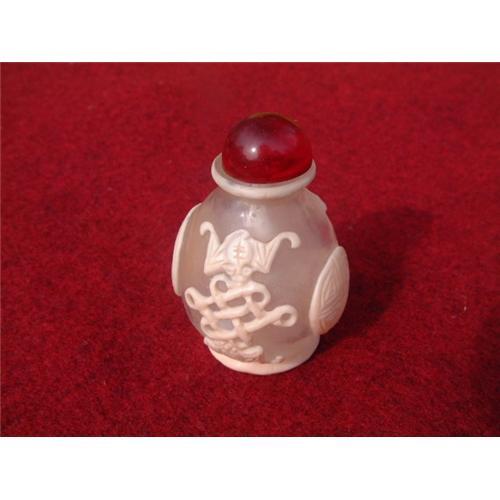 Bi-color Peking glass snuff bottle featuring 2 bats on each side facing the Buddhist emblem of endless knot. The outlay is ivory-cream color on a transparent background. A shou sign of good luck separates the bats on the sides. The bat (phou) also represents the good luck. Height: 2.5" (6.5 cm.).