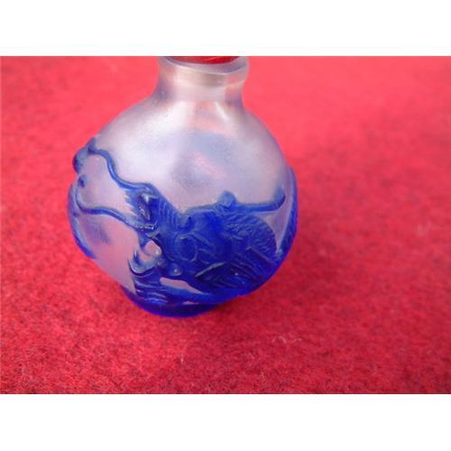 Bi-color Peking glass snuff bottle featuring a dragon. The outlay carving was done with intricate details on cobalt-blue Peking glass on a clear glass background. Height: 2.8" (7 cm.).