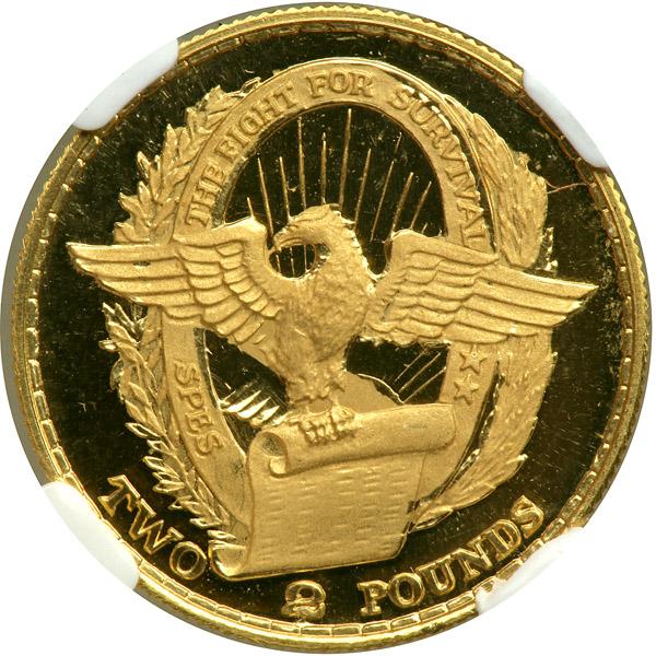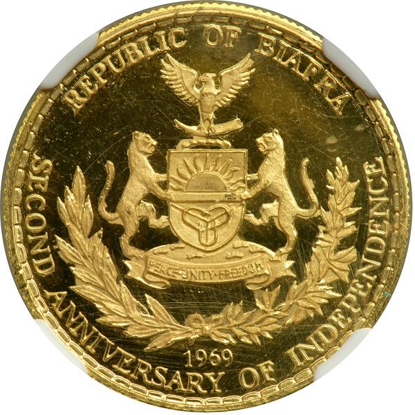 Biafra. 2 Pounds, 1969. Fr-4; KM-8. Weight 0.2355 ounce. Second Anniversary of Independence. Only issue of gold coinage from Biafra. Mintage 3,000 pieces. NGC graded Proof 66 Ultra Cameo.