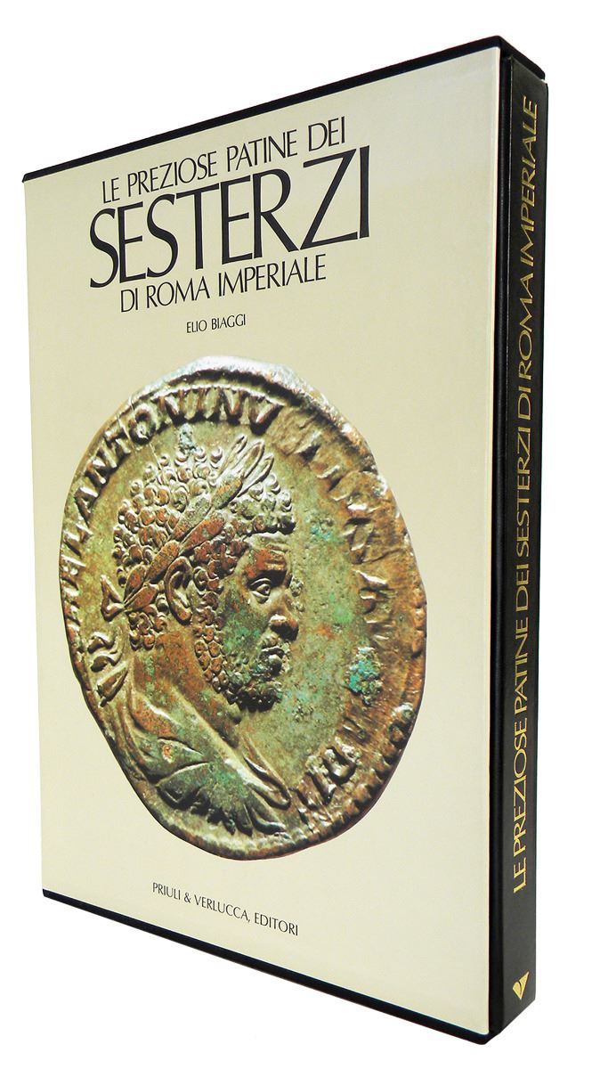 Biaggi, Elio. LE PREZIOSE PATINE DEI SESTERZI DI ROMA IMPERIALE / THE SUPERB PATINAS OF THE SESTERTII OF IMPERIAL ROME. Ivrea: Priuli & Verlucca, 1992. Folio [35 by 24.5 cm], original black leatherette, gilt; pictorial slipcase. 299, (5) pages; illustrated throughout in full color. Bilingual. Fine. A handsome production featuring outstanding color illustrations of both sides of 735 coins, depicted at 150% of actual size, along with 56 full-page enlargements.