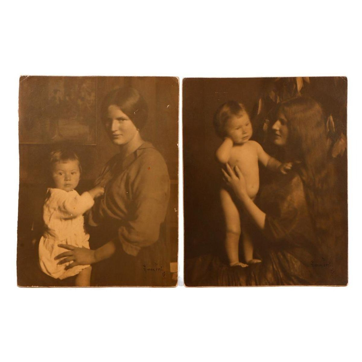 Artist: Bianca Conti (Royce) (1881-1954). Title/Description: Elsie Whitaker Martinez with toddler Micaela, one with Elsie's long hair flowing, the other with her hair up (2 works). Signature: Each signed on the image, lower right, and inscribed "SF". Date Created: c. 1914-1915. Medium/Ground: Photographs laid down on cardboard. Size: 9 1/2in x 7 1/4in; 9 1/2in x 7in. Condition: Some surface/corner scratches/tears, slight spotting/staining on one. From the Family of Xavier Martinez (1869-1943), Elsie Whitaker Martinez (1890-1984), and Micaela Martinez DuCasse (1913-1989).