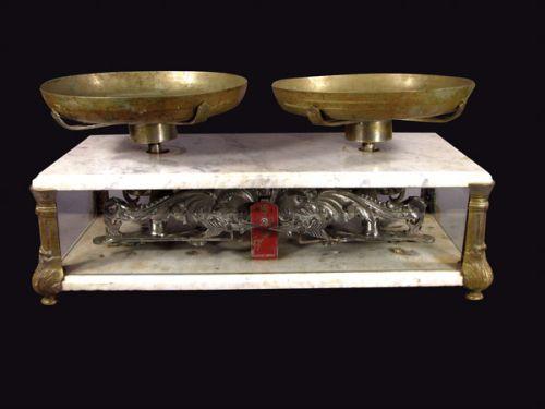 Bianchi Balance Scale with brass pans. Some chipping to marble otherwise good original condition. 28 X 12 1/2 inches.