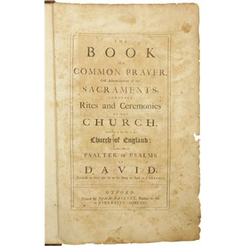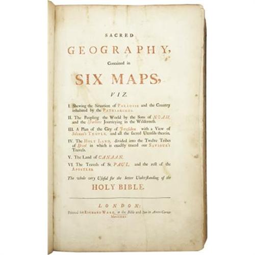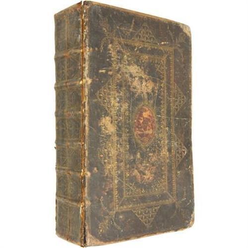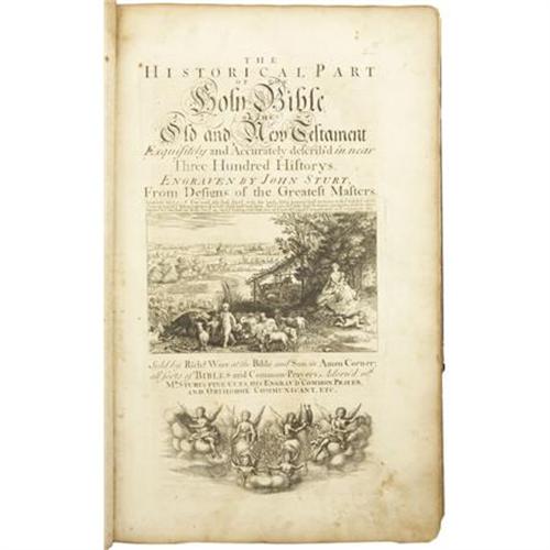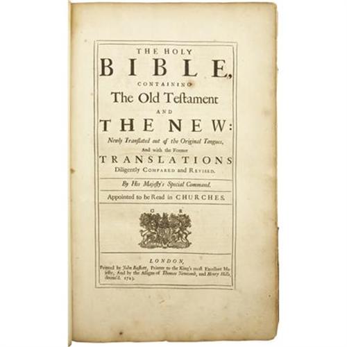 <B>[Bible in English]. </B></I><B><I>The Holy Bible, Containing The Old Testament and The New</B></I></B></I><B>:</B></I> Newly Translated out of the Original Tongues, And with the Former Translations Diligently Compared and Revised. By His Majesty's Special Command. Appointed to Read in Churches. London: Printed by John Baskett, Printer to the King's most Excellent Majesty, And by the Assigns of Thomas Newcomb, and Henry Hills, deceas'd, 1723.<BR><BR>[Bound together with:]<BR><BR><B><I>The New Testament of Our Lord and Saviour Jesus Christ</B></I></B></I><B>,</B></I> Newly Translated out of the Original Greek, And with the Former Translations Diligently Compared and Revised...London: Printed by John Baskett..., 1722.<BR><BR>[And (as the first work in the volume):]<BR><BR><B><I>The Book of Common Prayer</B></I></B></I><B>, </B></I>And Administration of the Sacraments, And Other Rites and Ceremonies of the Church, According to the Use of the Church of England: Together with the Psalter or Psalms of David, Pointed as they are to be Sung or Said in Churches. Oxford: Printed by John Baskett, Printer to the University, 1721.<BR><BR>[And:]<BR><BR><B><I>The Whole Book of Psalms, Collected into English Metre</B></I></B></I><B>,</B></I> By Thomas Sternhold, John Hopkins, and Others, Conferred with the Hebrew...London: Printed by Susanna Collins, for the Company of Stationers, 1716.<BR><BR>Large folio (15.6875 x 9.8125 inches). [416, "The Old Testament"]; [106, <I>The New Testament</B></I>]; [12, "Index"]; [61, <I>The Book of Common Prayer</B></I>]; [28, <I>The Whole Book of Psalms</B></I>] leaves. Text in double columns (<I>The Whole Book of Psalms</B></I> in triple columns). Engraved frontispiece portrait of George II by J. Cole. Historiated woodcut initials.<BR><BR>This copy contains sixty-six engraved plates, with four engravings on each plate, with special engraved title: <B><I>The Historical Part of the Holy Bible</B></I></B></I>. Or the Old and New Testament Exquisitely and Accurately describ'd in near Three Hundred Historys. Engraven by John Sturt, From Designs of the Greatest Masters. [London]: Sold by Richd. Ware at the Bible and Sun in Amen-Corner, [n.d.]. There are also six double-page engraved maps with separate title printed in red and black: <B><I>Sacred Geography Contained in Six Maps</B></I></B></I><B>,</B></I> viz. I. Shewing the Situation of Paradise and the Country inhabited by the Patriarchs. II. The Peopling the World by the Sons of Noah, and the Israelites Journeying in the Wilderness. III. A Plan of the City of Jerusalem with a View of Solomon's Temple, and all the sacred Utensils therin. IV. The Holy Land, divided into the Twelve Tribes of Israel in which is exactly traced our Saviour's Travels. V. The Land of Canaan. VI. The Travels of St. Paul, and the rest of the Apostles. The whole very Useful for the better Understanding of the Holy Bible. London: Printed for Richard Ware, at the Bible and Sun in Amen-Corner, 1725. The engraved title for <I>The Historical Part of the Holy Bible</B></I> is bound before the title for <I>The Holy Bible</B></I>, and the title for the <I>Sacred Geography</B></I> is bound following the dedication leaf.<BR><BR>Contemporary black calf (worn). Covers decoratively panelled in gilt with central oval red morocco onlay decoratively tooled in gilt with the letters "JHS" in the center, spine elaborately tooled in gilt in seven compartments with six raised bands, board edges and turn-ins decoratively tooled in gilt, marbled endpapers. Unfortunately, the joints are cracked and the boards are detached. Some foxing, browning, and occasional staining. A few short tears. Early ink and pencil ownership inscriptions on front free endpaper and flyleaf. Early ink annotations on the verso of the plate at Kkkk4, being a history of the Ash family, beginning with Caleb Ash (1744-1797), son of Joshua and Alice Ash. Additional early ink annotations on rear endleaves.<BR><BR>Darlow and Moule 754 and 749. Herbert 965 and 958. ESTC T81309 (<I>The Holy Bible</B></I>), T81268 (<I>The Book of Common Prayer</B></I>), and T82337 (<I>The Whole Book of Psalms</B></I>).<BR><BR><b>Shipping:</b> Books & Catalogs (<a target="_blank" href="http://www.heritageauctions.com/common/shipping.php">view shipping information</a>)
