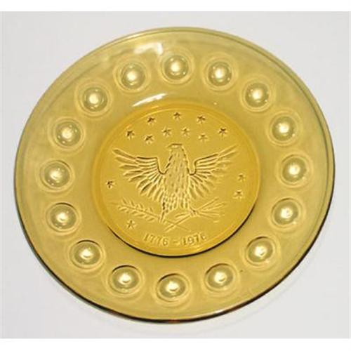 This set of four United States Bicentennial plates includes the Liberty Bell, the Revolutionary Cannon, the US Shield and the Presidential Seal (eagle). Manufactured by Anchor Hocking, in lustrous honey yellow glass, to commemorate our Nation's 200th Birthday. They each measure 8" in diameter and are all in excellent condition.