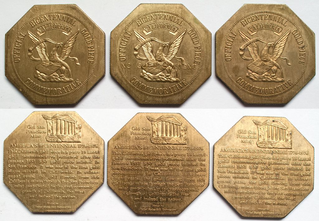 Three official bicentennial facsimile patterned after the famous 1851 $50 gold piece minted in San Francisco. Bill Weber Collection. City: County: State: CADate: 1976