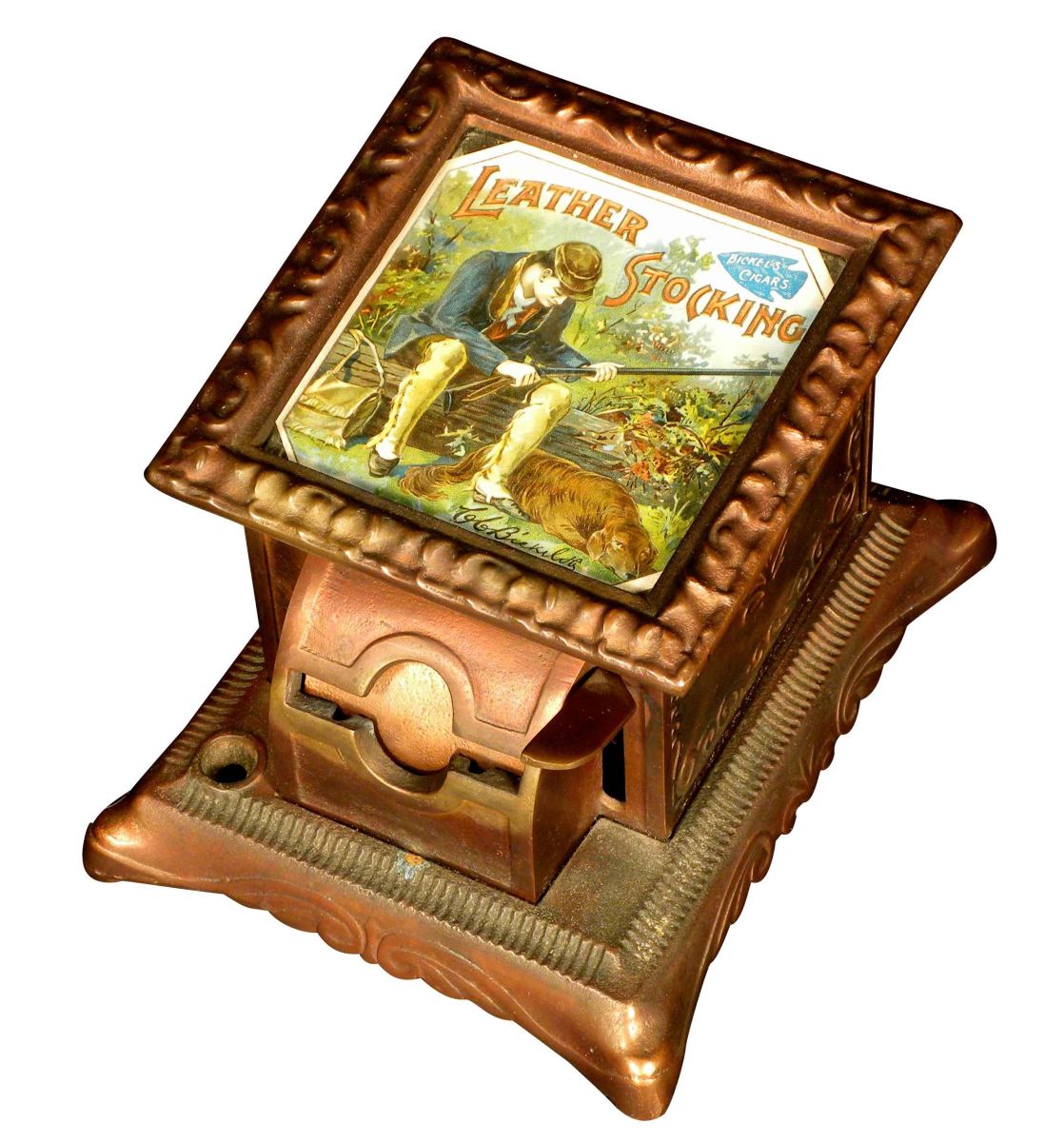 Bickel's Leather Stocking Cigar Tip Cutter/Match Holder. Copper flashed, excellent working condition. 6 1/2 X 5 1/2 X 8 inches.