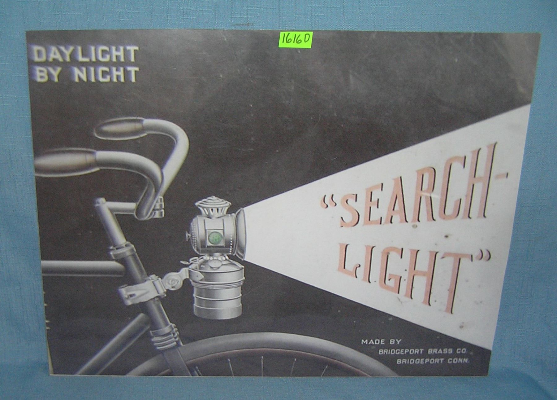 Bicycle search light by Bridgeport Brass Company retro style advertising sign 12 inches by 16 inches these signs are printed on PVC hard board and are sold for their decorative display purpose est. value $40.00-$50.00