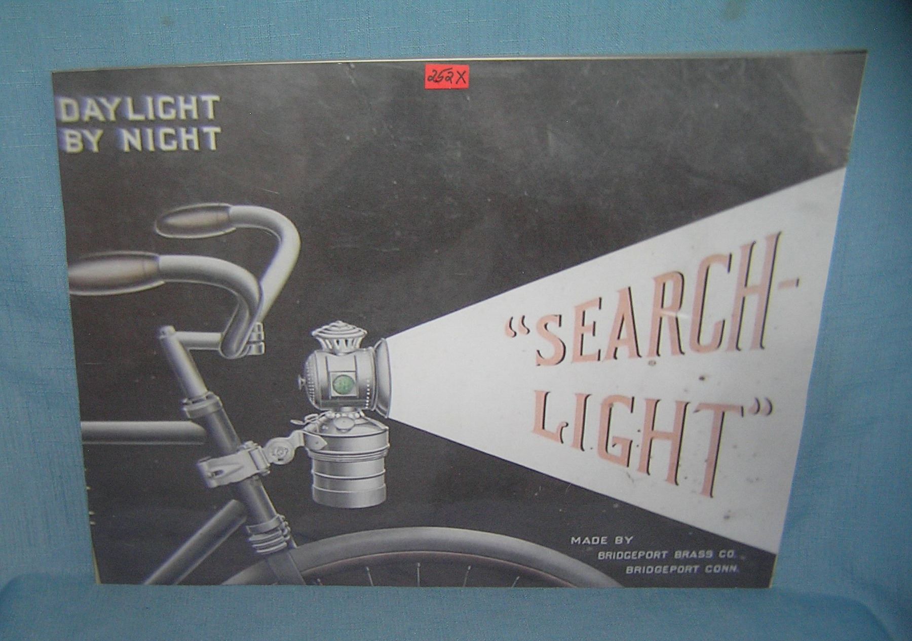 Bicycle search light retro style advertising sign 12 inches by 16 inches these signs are printed on PVC hardboard and are auctioned for there decorative and display purposes est. value $40.00-$50.00