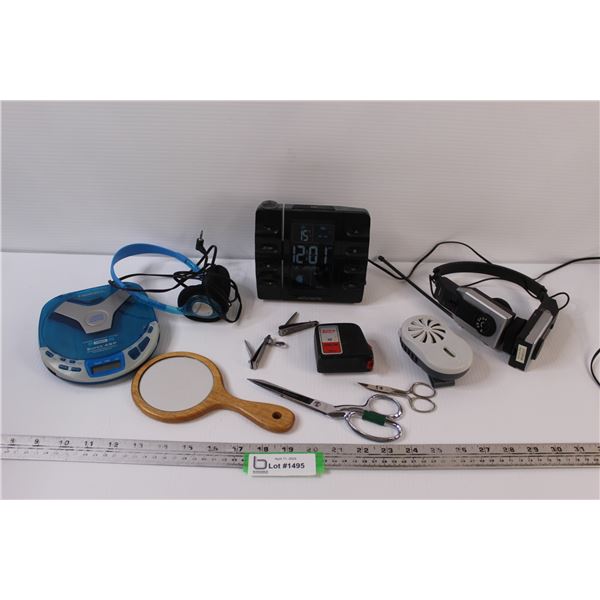 Discman / doesn't power up; Digital Alarm Clock - Powers On; Tape Measure; Personal Grooming Items; Misc.