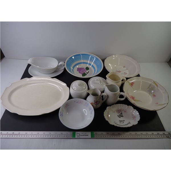 Large Lot of Assorted Serving Bowls, Gravy Boat, Serving Tray, Cream And Sugar Sets as pictured
