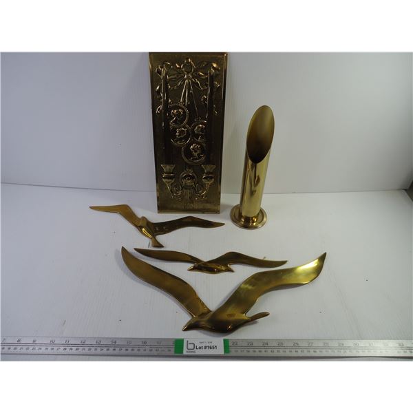 (3) Brass Birds in Flight, Brass Wall Plaque and Brass Bud Vase1651 - (3) Brass Birds in Flight, Brass Wall Plaque and Brass Bud Vase