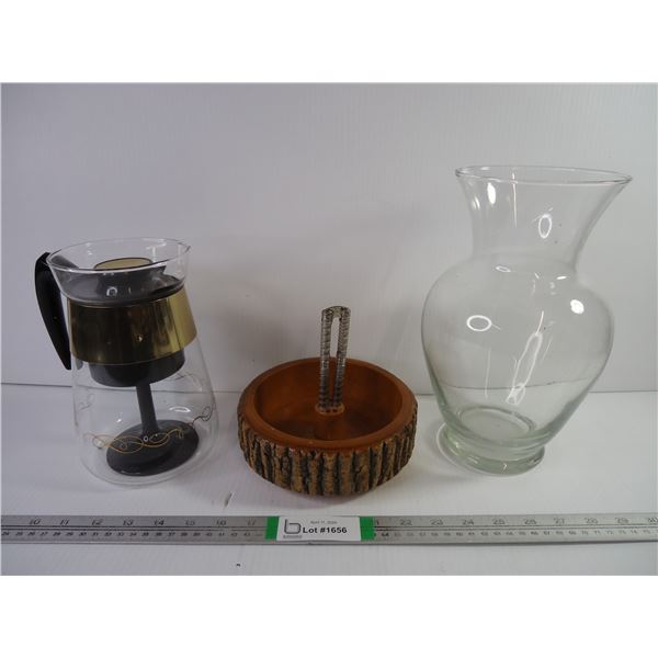 Vintage Wooden Nutcracker Bowl, Corning 6 cup Percolator and Glass Vase1656 - Vintage Wooden Nutcracker Bowl, Corning 6 cup Percolator and Glass Vase
