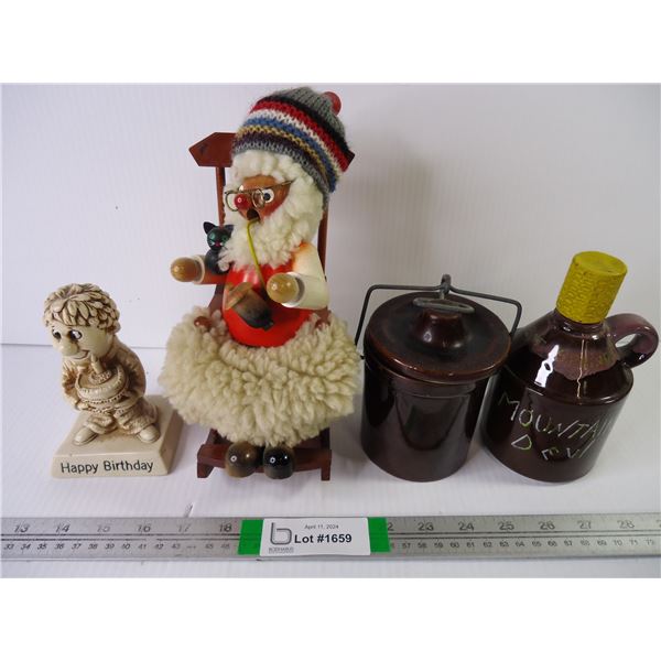 (4) Ornamental Items-(2) Small Crocks, Happy Birthday Statue and Rocking Chair Figure