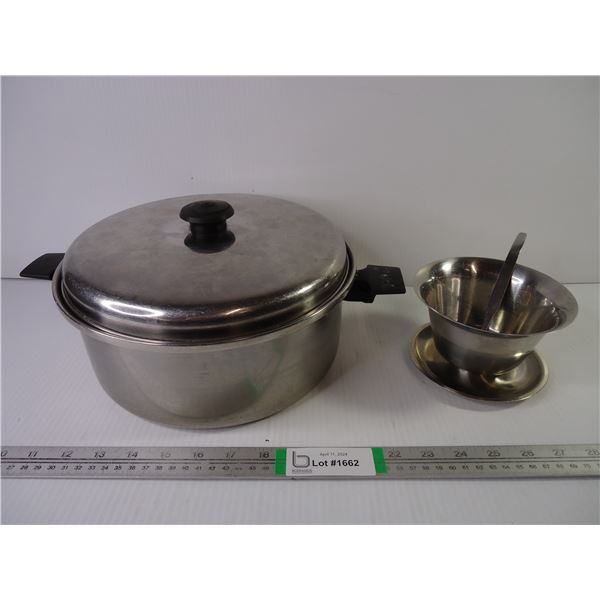 Vintage Metal Condiment Dish with Serving Spoon and Large Stock Pot